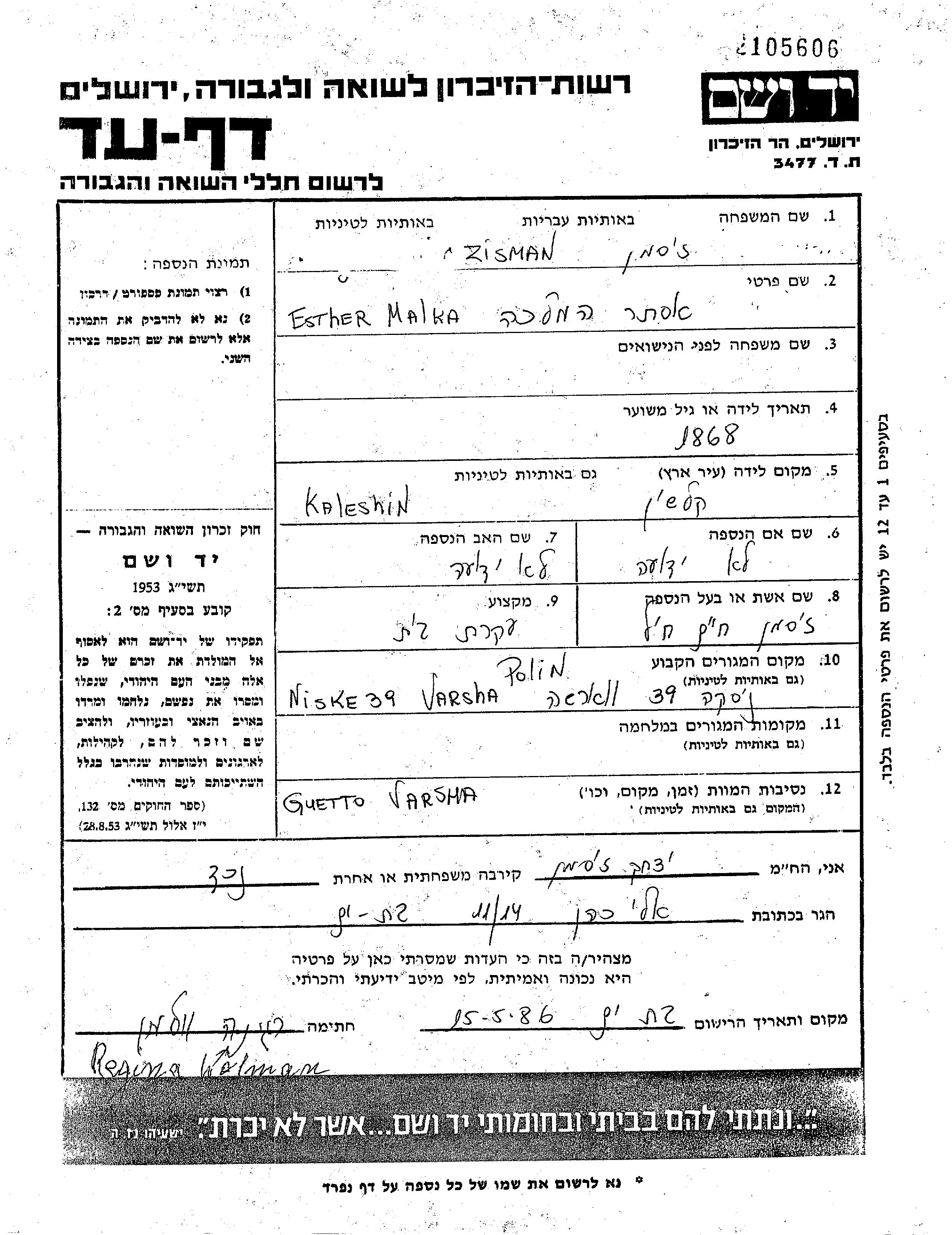 Esther Malka Zisman wurde in Kaluszyn, Polen geboren. Sie war Hausfrau und mit Haim Yekhiel Verheiratet. Vor dem Zweiten Weltkrieg lebte sie in Warszawa, Polen. Während des Krieges war sie in Warszawa, Polen.