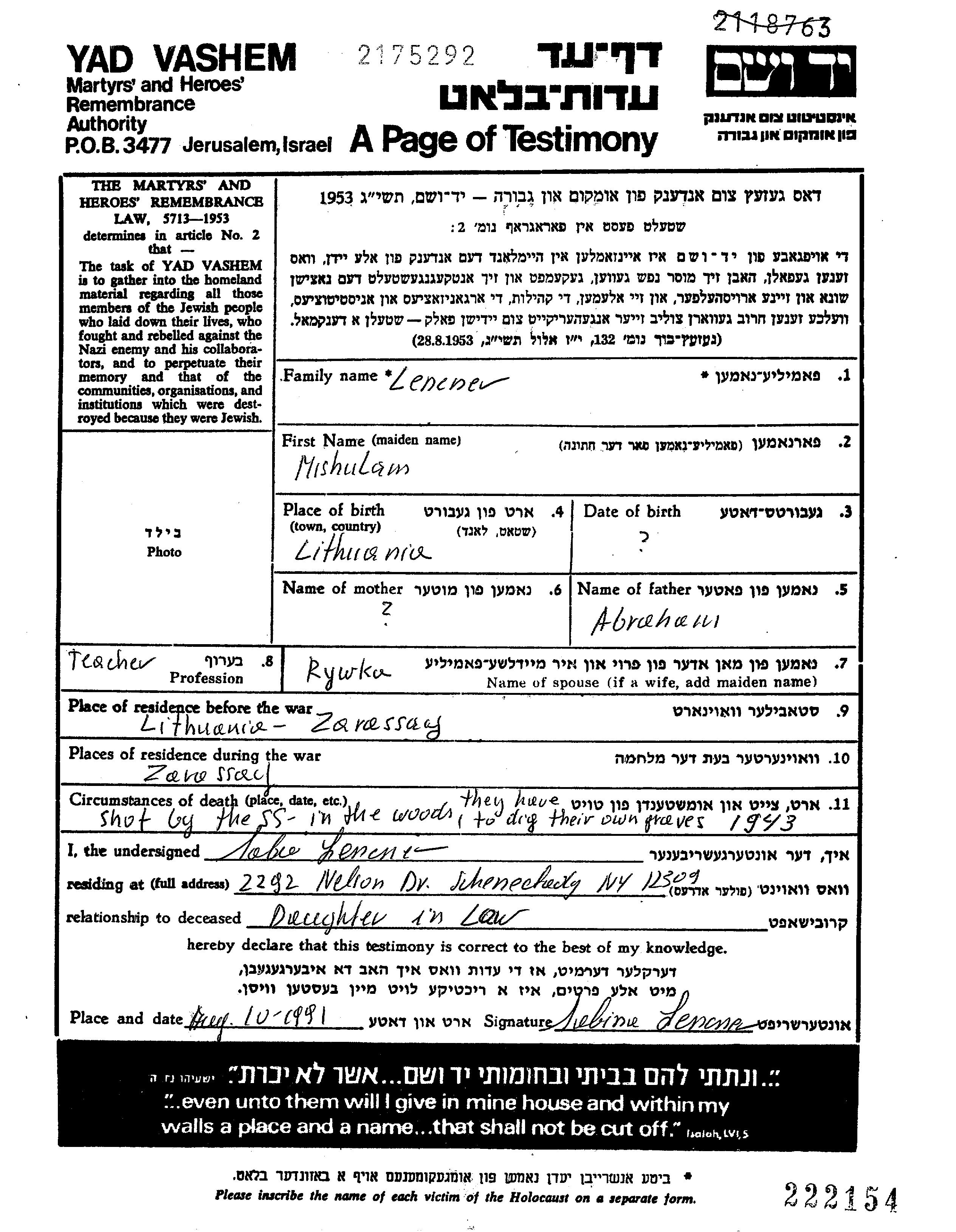 Mishulam Lencner wurde in Litauen geboren. Er war der Sohn von Abraham. Er war Lehrer/in und mit Rywka Verheiratet. Vor dem Zweiten Weltkrieg lebte er in Zarasai, Litauen. Während des Krieges war er in Zarasai, Litauen.