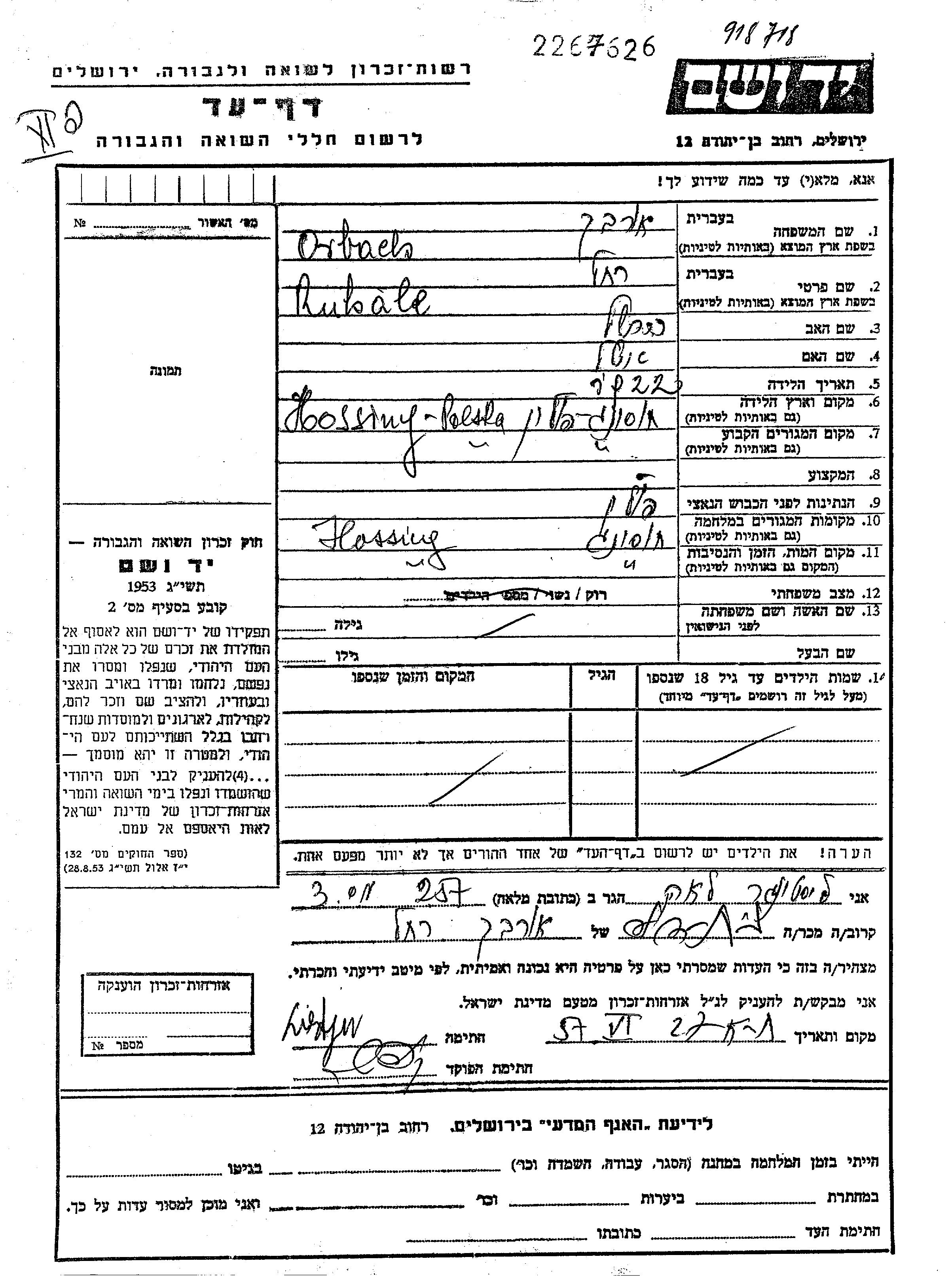Ruhele Orbach Orbakh wurde im Jahr 1922 in Hossing, Polen geboren. Sie war die Tochter von Hershel und Etel. Sie war Ledig. Vor dem Zweiten Weltkrieg lebte sie in Hossing, Polen. Während des Krieges war sie in Hossing, Polen.