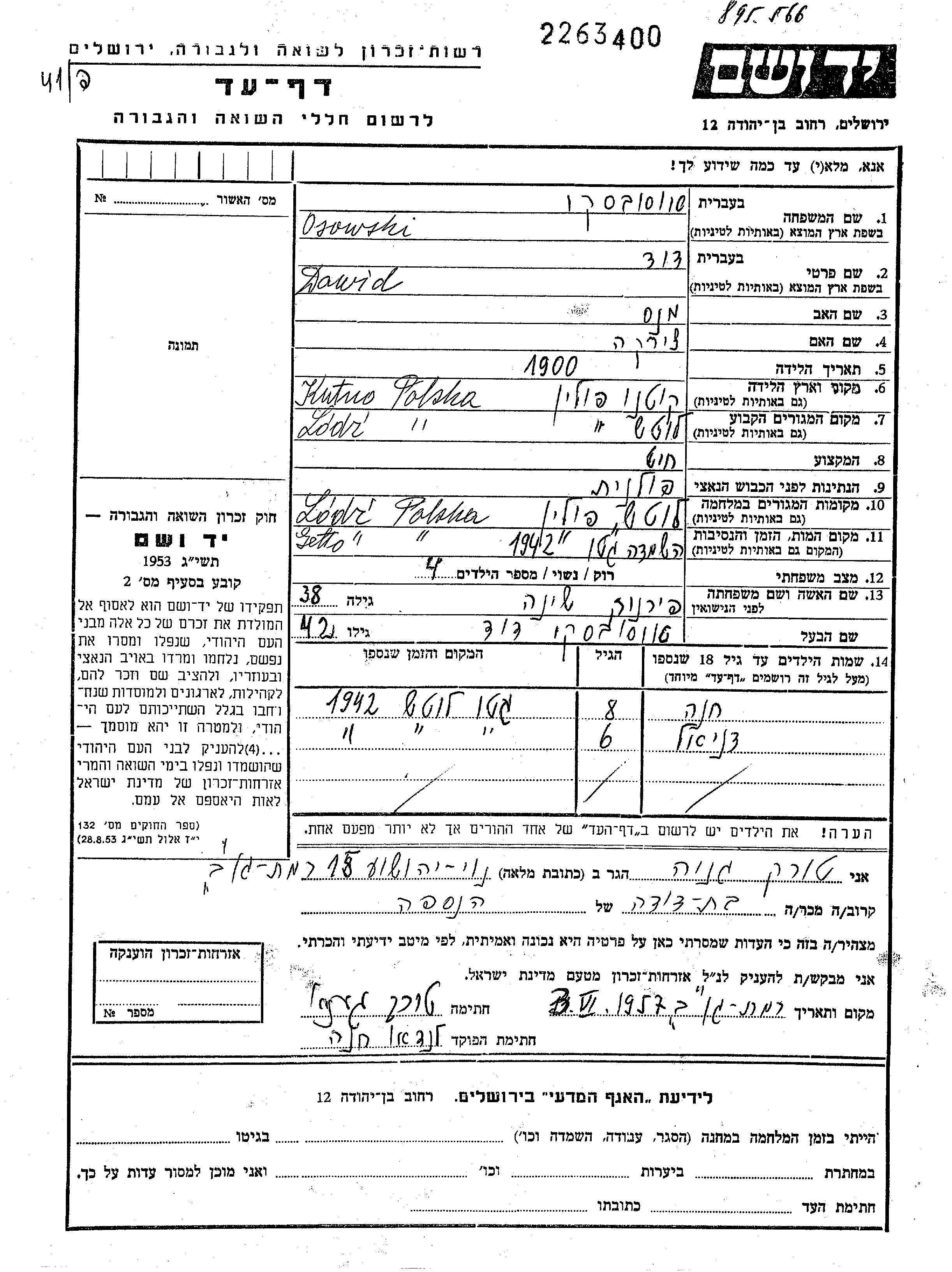Dawid Osowski wurde im Jahr 1900 in Kutno, Polen geboren. Er war der Sohn von Manes und Cirka. Er war Schneider und mit Scheina Verheiratet. Vor dem Zweiten Weltkrieg lebte er in Lodz, Polen. Während des Krieges war er in Lodz, Polen.