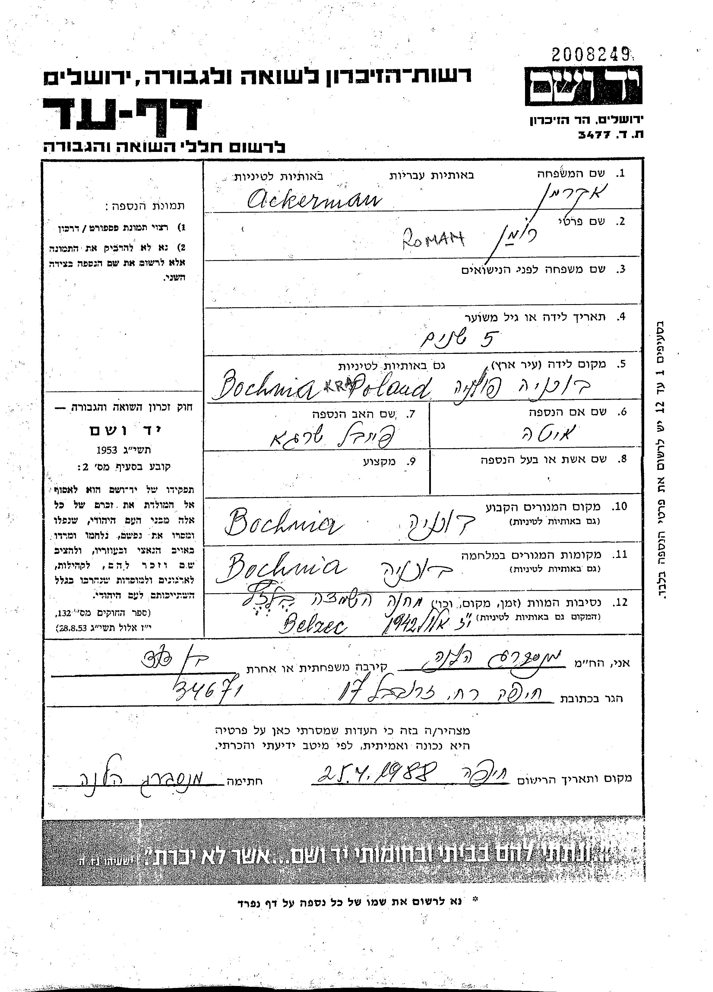 Roman Ackerman wurde im Jahr 1937 in Bochnia, Polen geboren. Er war der Sohn von Faivel Shraga und Ita. Er war Kind. Vor dem Zweiten Weltkrieg lebte er in Bochnia, Polen. Während des Krieges war er in Bochnia, Polen.