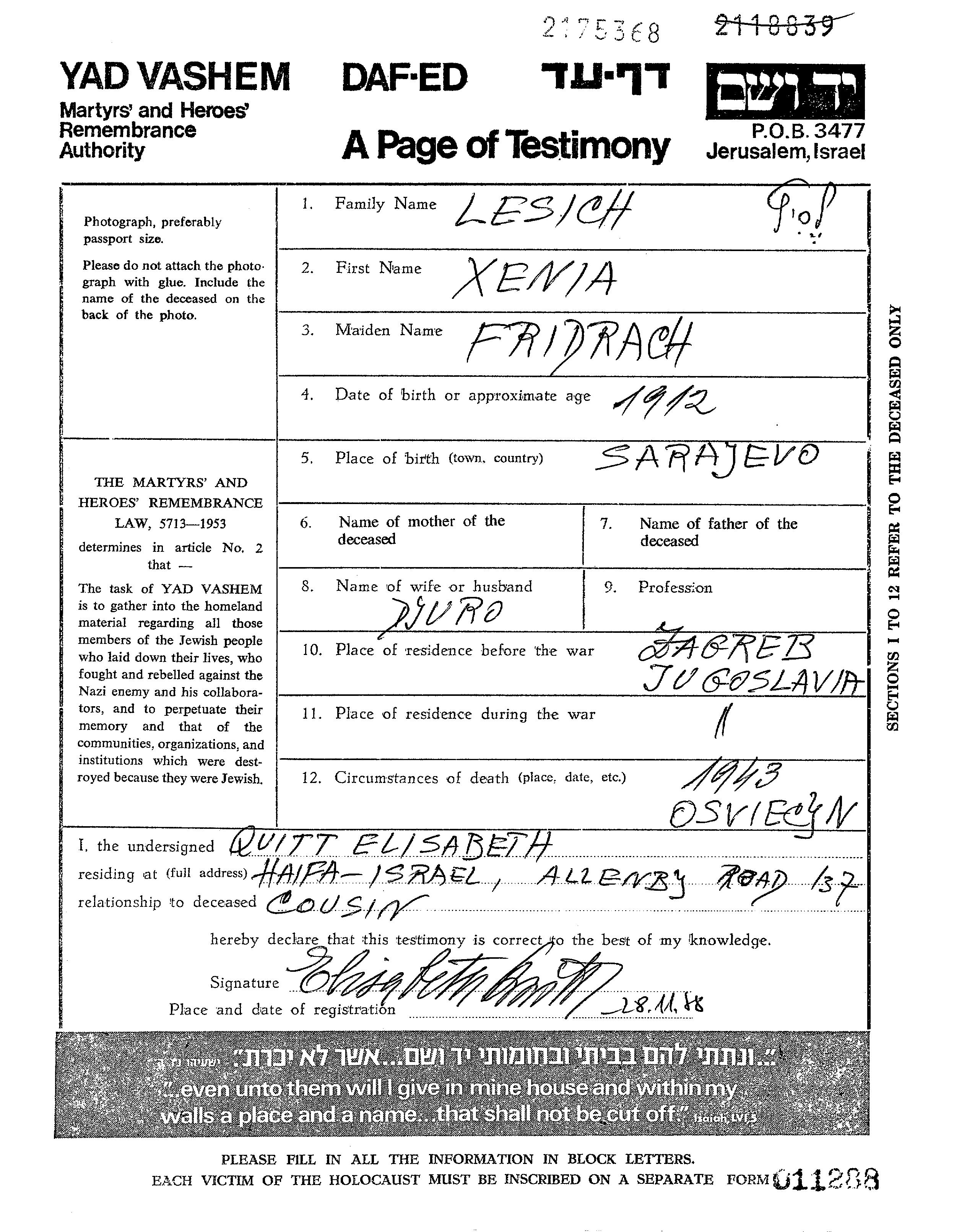 Xenia Levy Lesik, geb. Fridrach wurde im Jahr 1912 in Sarajevo, Jugoslawien geboren. Sie war mit Djuro Verheiratet. Vor dem Zweiten Weltkrieg lebte sie in Zagreb, Jugoslawien. Während des Krieges war sie in Zagreb, Jugoslawien.