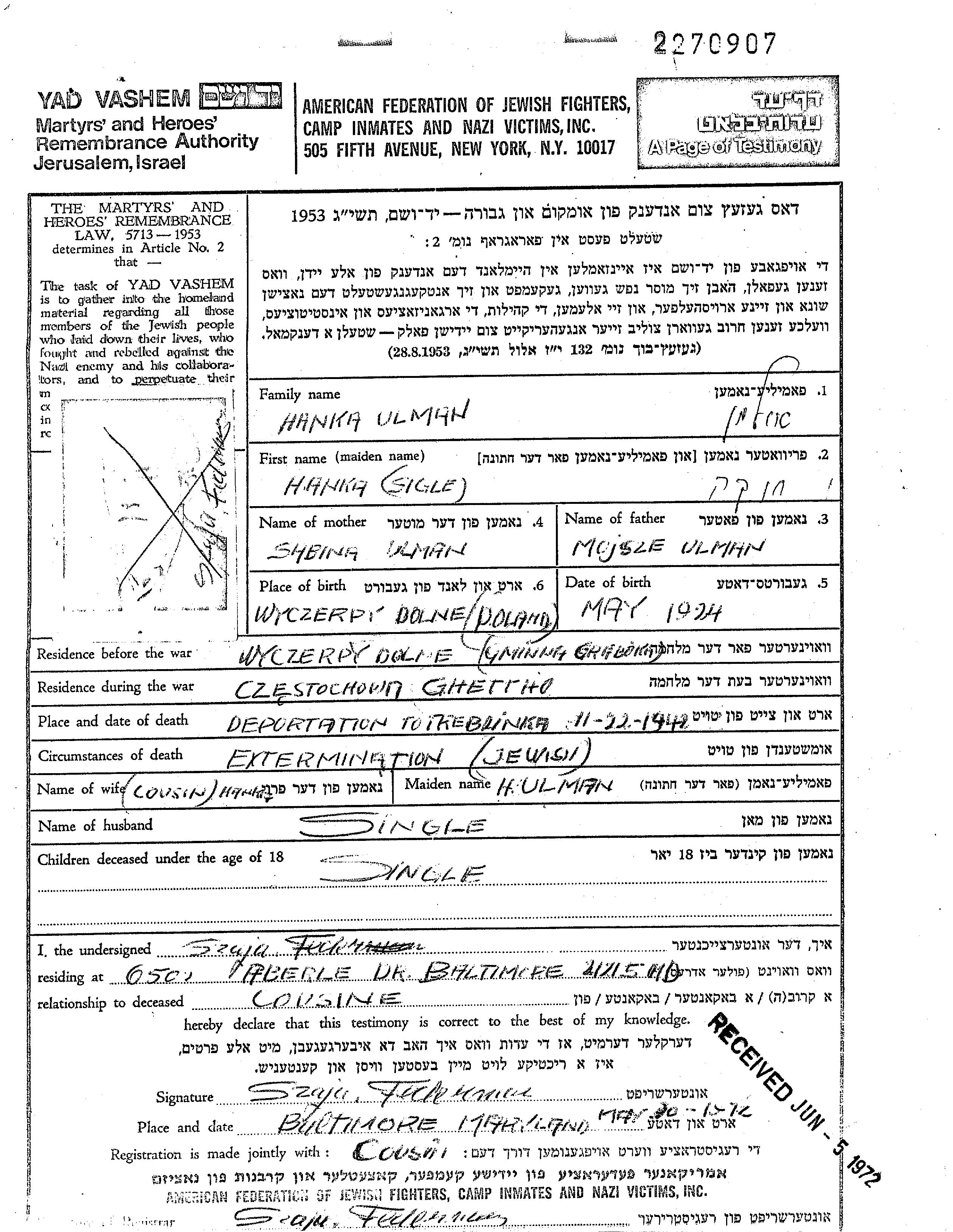 Hanka Ulman wurde im Jahr 1924 in Wyczerpy Dolne, Polen geboren. Sie war die Tochter von Mojsze und Sabina Sheina, geb. Bulwa. Sie war Ledig. Vor dem Zweiten Weltkrieg lebte sie in Wyczerpy Dolne, Polen. Während des Krieges war sie in Czestochowa, Polen.