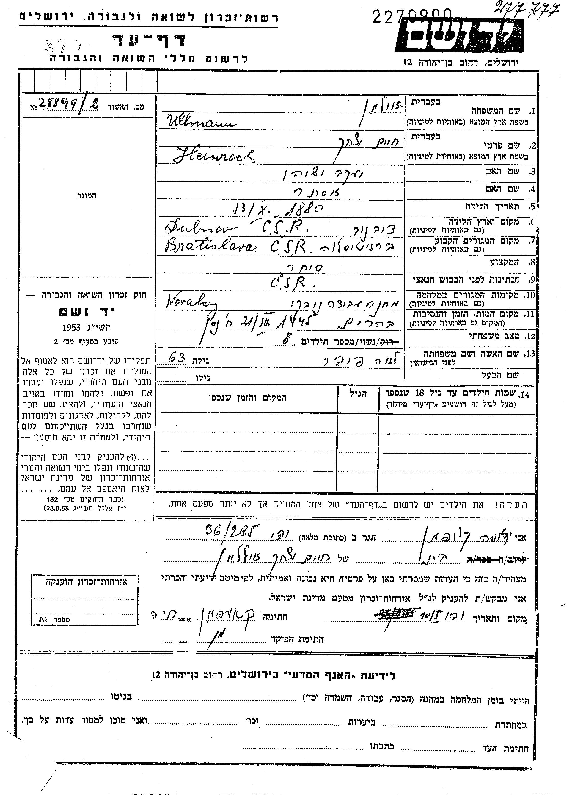 Heinrich Khaim Yitzkhak Ullmann wurde im Jahr 1880 in Dubnov geboren. Er war der Sohn von Yaakov Yeshaiahu und Ester. Er war Kaufmann/-frau und mit Lea Magdalena Verheiratet. Vor dem Zweiten Weltkrieg lebte er in Bratislava, Tschechoslowakei. Während des Krieges war er in Novaky, Tschechoslowakei.