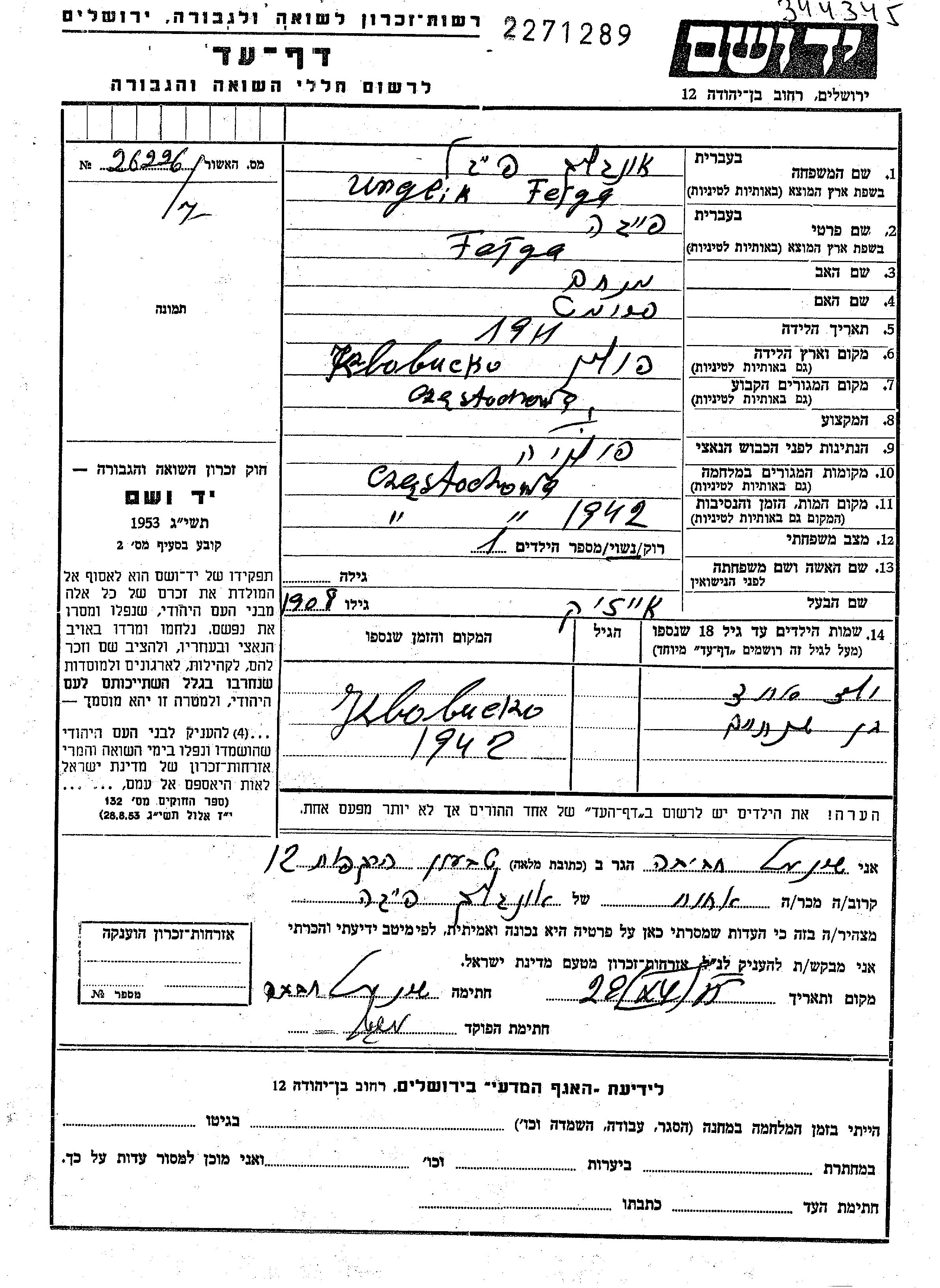 Fejga Unglik wurde im Jahr 1911 in Klobuck, Polen geboren. Sie war die Tochter von Menakhem und Frimet. Sie war mit Aizik Verheiratet. Vor dem Zweiten Weltkrieg lebte sie in Czestochowa, Polen. Während des Krieges war sie in Czestochowa, Polen.
