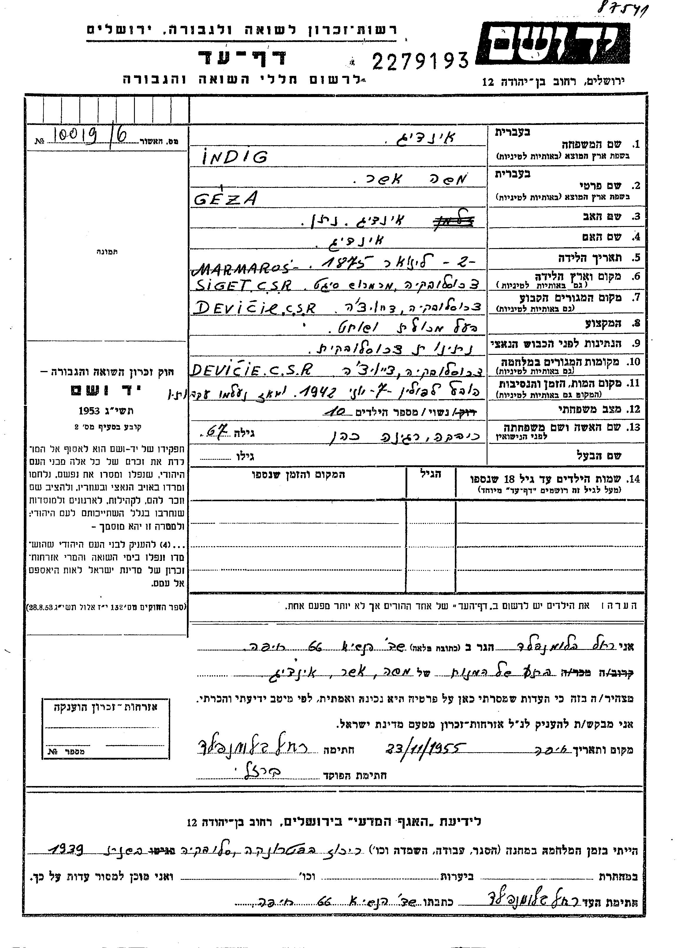 Moshe Asher Geza Indig wurde im Jahr 1875 in Maramarossziget, Rumänien geboren. Er war der Sohn von Natan. Er war Besitzer/-in eines lebensmittelgeschäfts und mit Rivka Regina Verheiratet. Vor dem Zweiten Weltkrieg lebte er in Devicie, Tschechoslowakei. Während des Krieges war er in Devicie, Tschechoslowakei.