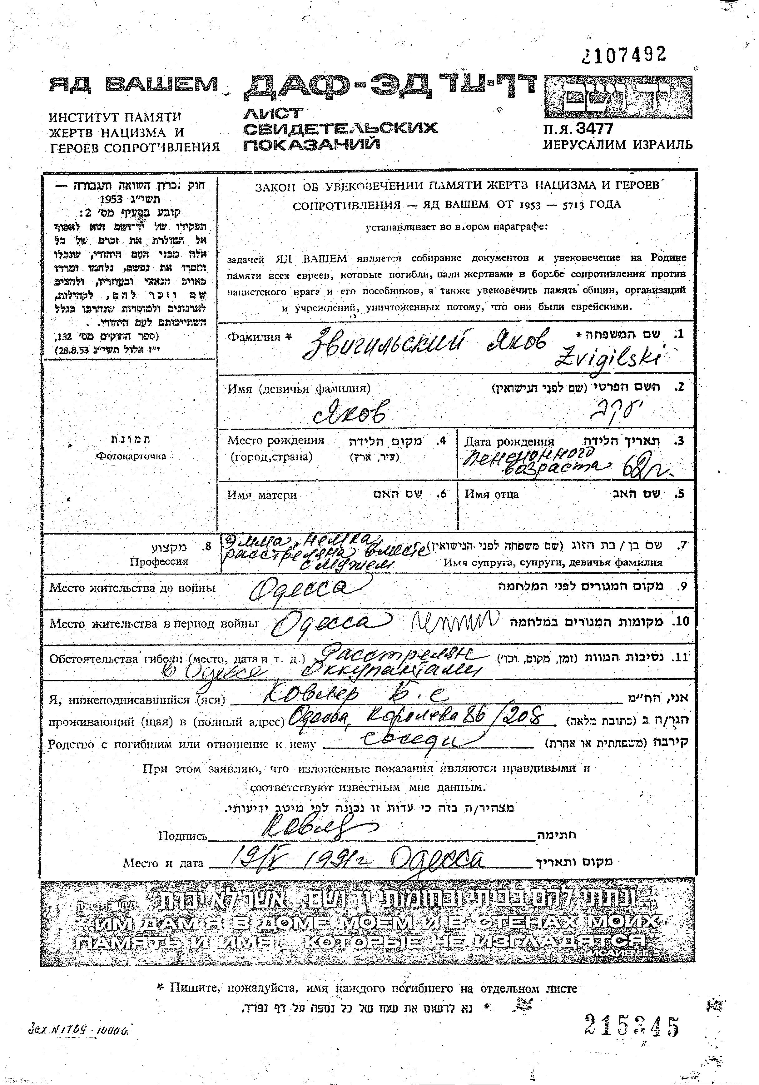 Yakov Zvigilski. Er war mit Ema Verheiratet. Vor dem Zweiten Weltkrieg lebte er in Odessa, Ukraine (UdSSR). Während des Krieges war er in Odessa, Ukraine (UdSSR).