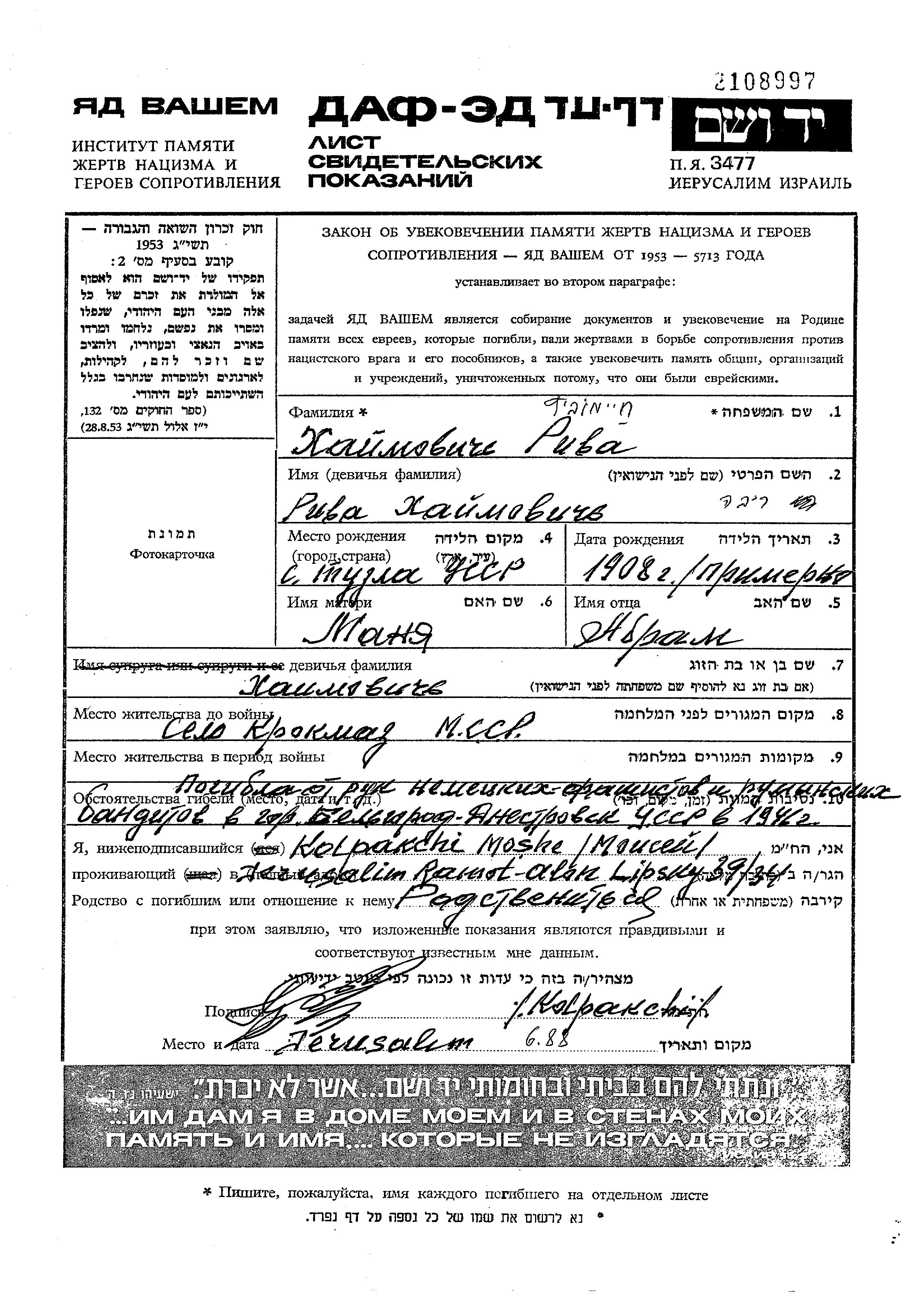 Riva Khaimovich wurde im Jahr 1908 in Tuzly, Ukraine (UdSSR) geboren. Sie war die Tochter von Abram und Manya. Sie war Ledig. Vor dem Zweiten Weltkrieg lebte sie in Corcmaz, Rumänien. Während des Krieges war sie in Bessarabia, Rumänien.