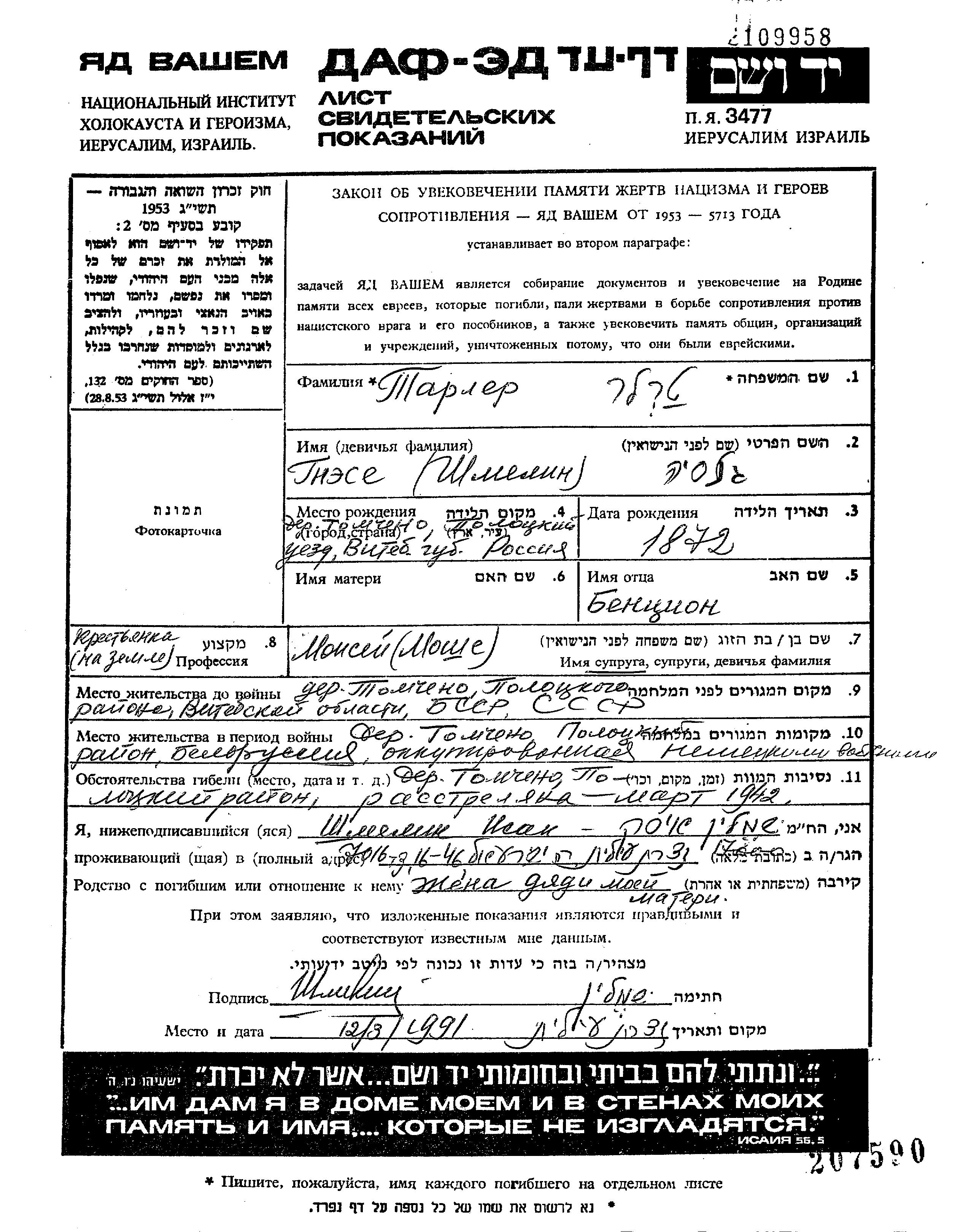 Gnese Gnesia Tarler Traler, geb. Shmelin Shmeilin wurde im Jahr 1872 in Tomchino, Weißrussland (UdSSR) geboren. Sie war die Tochter von Bentzion. Sie war Landwirt und mit Moisei Verheiratet. Vor dem Zweiten Weltkrieg lebte sie in Tomchino, Weißrussland (UdSSR). Während des Krieges war sie in Tomchino, Weißrussland (UdSSR).