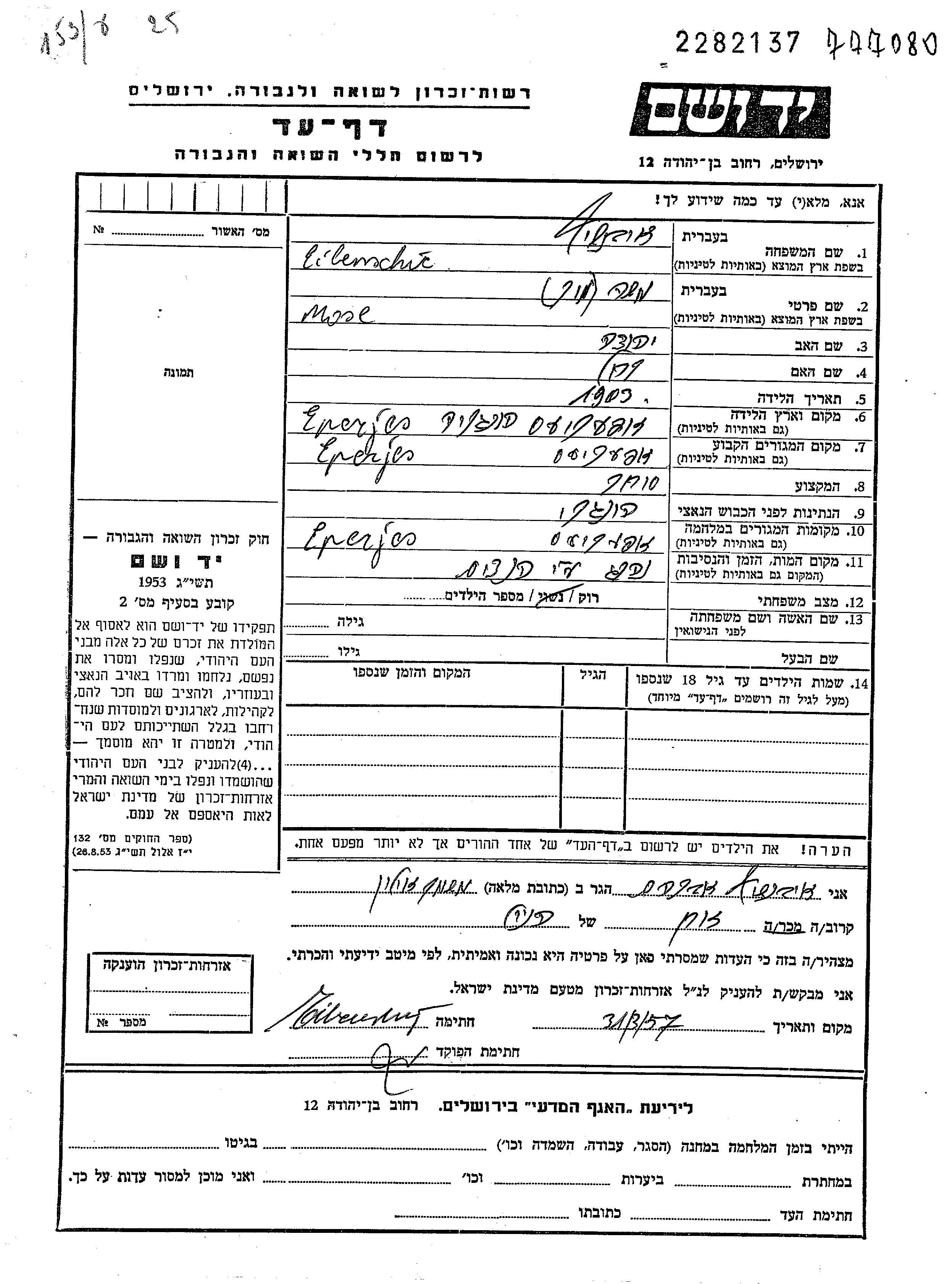 Mose Mor Eibenschic wurde im Jahr 1903 in Eperjes, Tschechoslowakei geboren. Er war der Sohn von Yehuda und Rakhel Roza. Er war Kaufmann/-frau und Ledig. Vor dem Zweiten Weltkrieg lebte er in Eperjes, Tschechoslowakei. Während des Krieges war er in Eperjes, Tschechoslowakei.