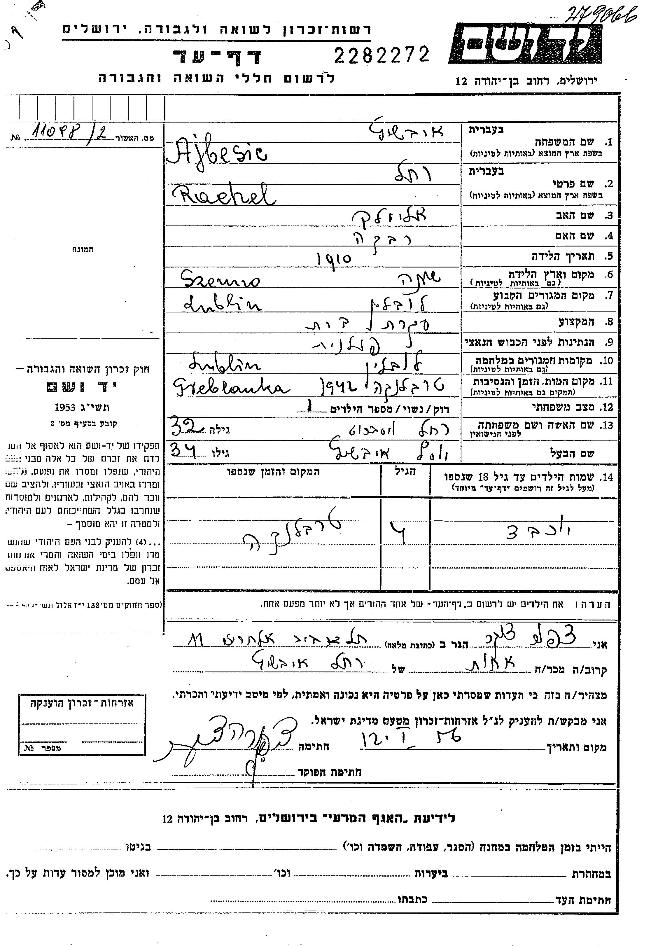 Rachel Ajbesic, geb. Veisbrot wurde im Jahr 1910 in Sienno, Polen geboren. Sie war die Tochter von Elimelekh und Rivka. Sie war Hausfrau und mit Yosef Verheiratet. Vor dem Zweiten Weltkrieg lebte sie in Lublin, Polen. Während des Krieges war sie in Lublin, Polen.