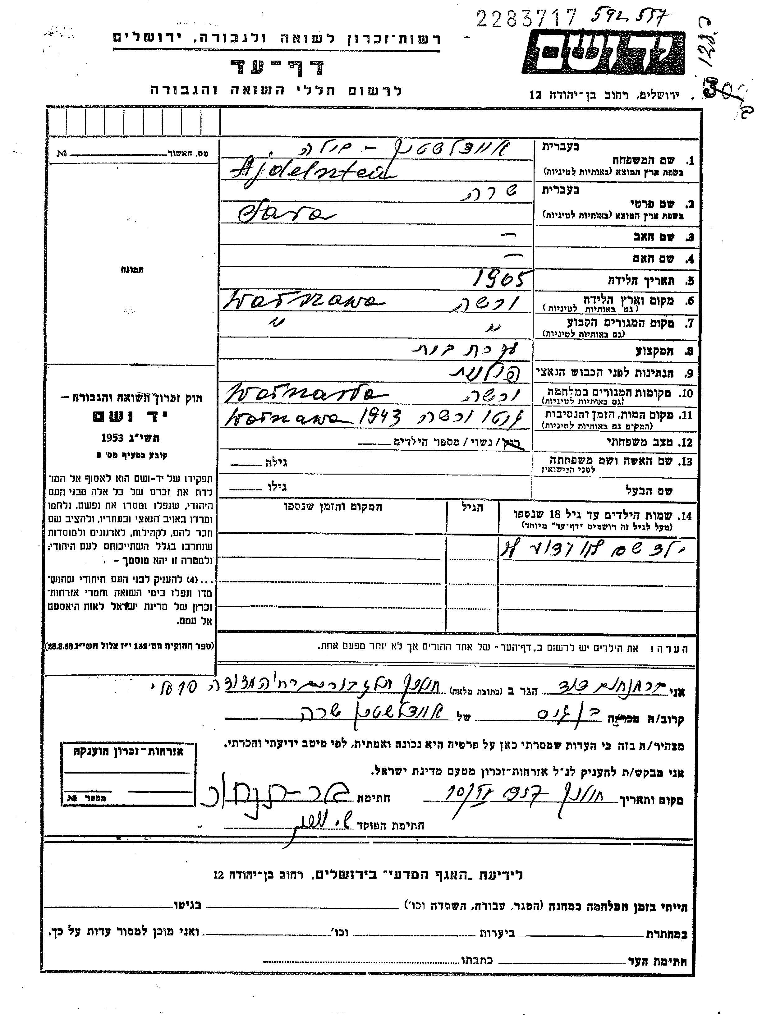 Ajdelsztein Sara 1905 Warszawa, Polen Gedenkblatt