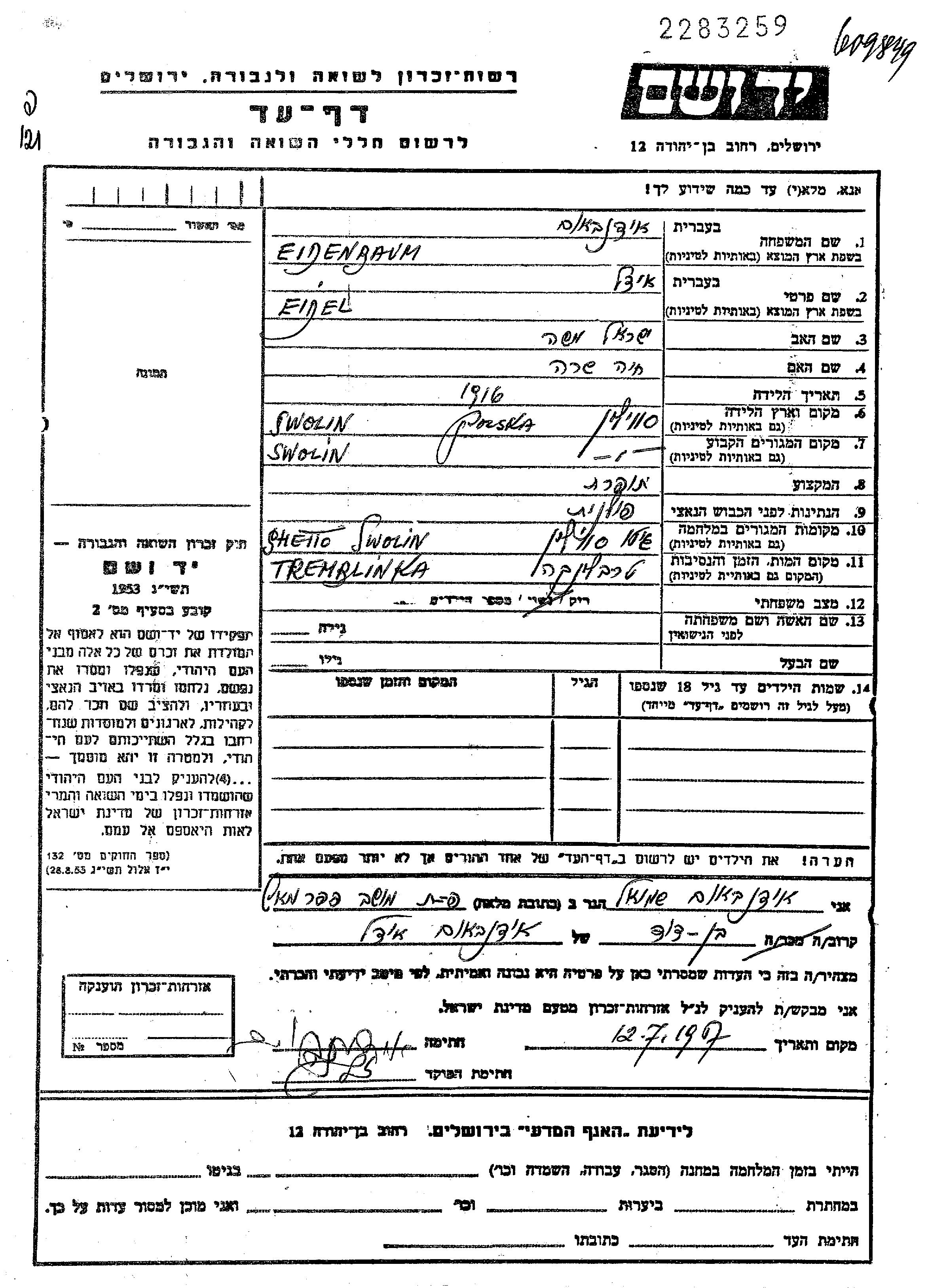 Eidel Idl Eidenbaum wurde im Jahr 1916 in Zwolin, Polen geboren. Sie war die Tochter von Israel Moshe und Chaja Sara. Sie war Schneiderin und Ledig. Vor dem Zweiten Weltkrieg lebte sie in Zwolin, Polen. Während des Krieges war sie in Zwolin, Polen.