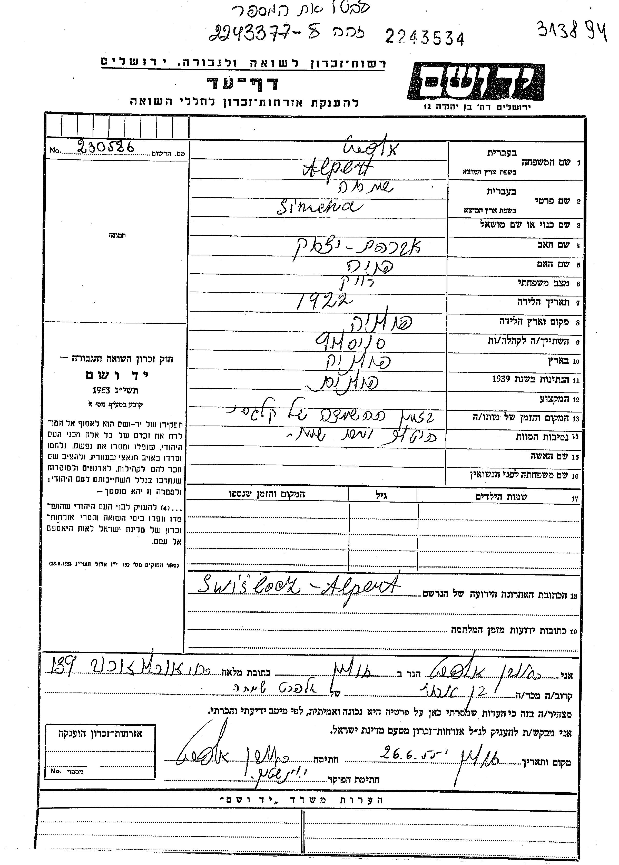 Alpert Simcha 1922 Sosnowice, Polen Gedenkblatt