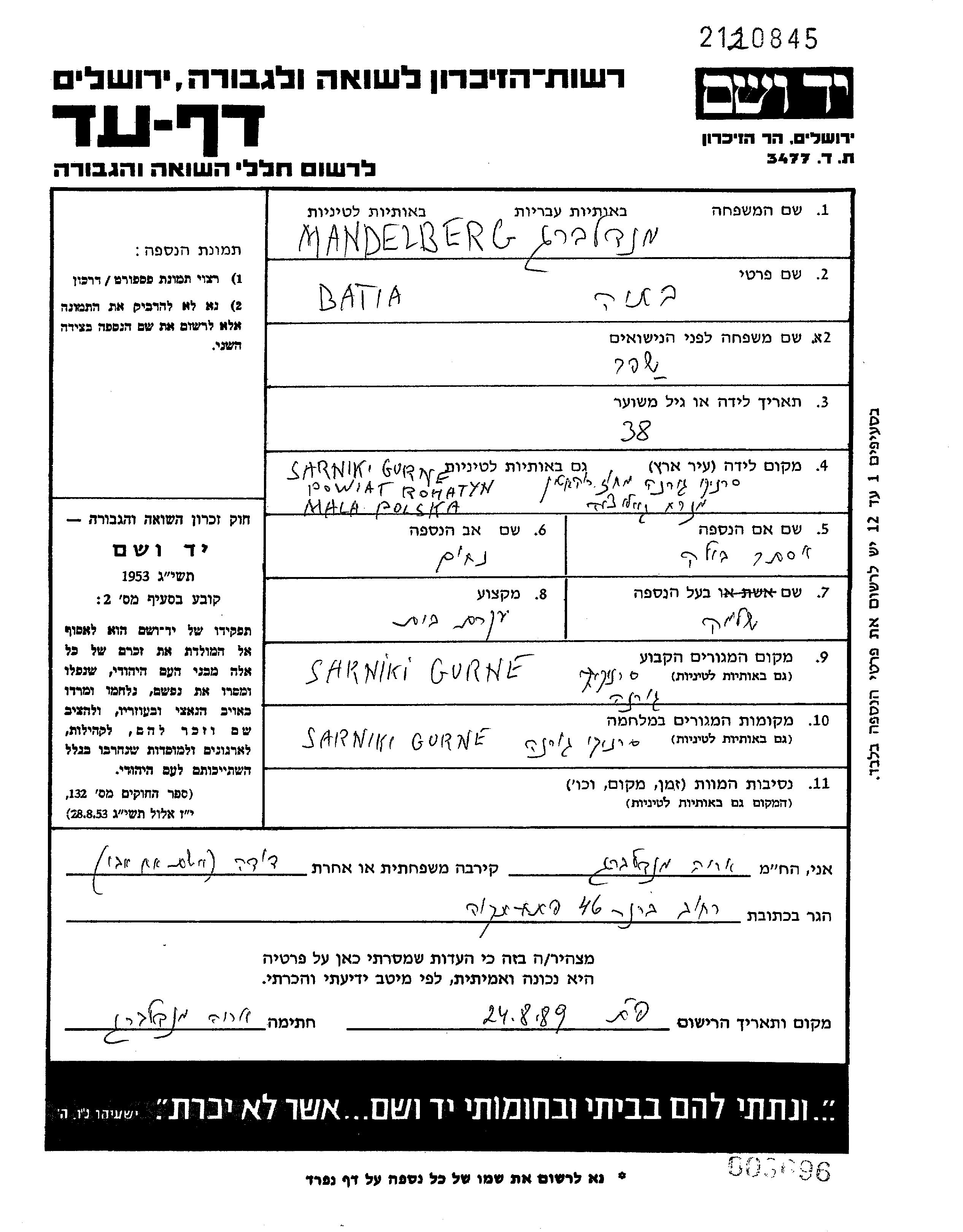 Batia Mandelberg, geb. Shefer wurde in Sarnki Gorne, Polen geboren. Sie war die Tochter von Nakhum und Bila Ester. Sie war Hausfrau und mit Schlomo Verheiratet. Vor dem Zweiten Weltkrieg lebte sie in Sarnki Gorne, Polen. Während des Krieges war sie in Sarnki Gorne, Polen.