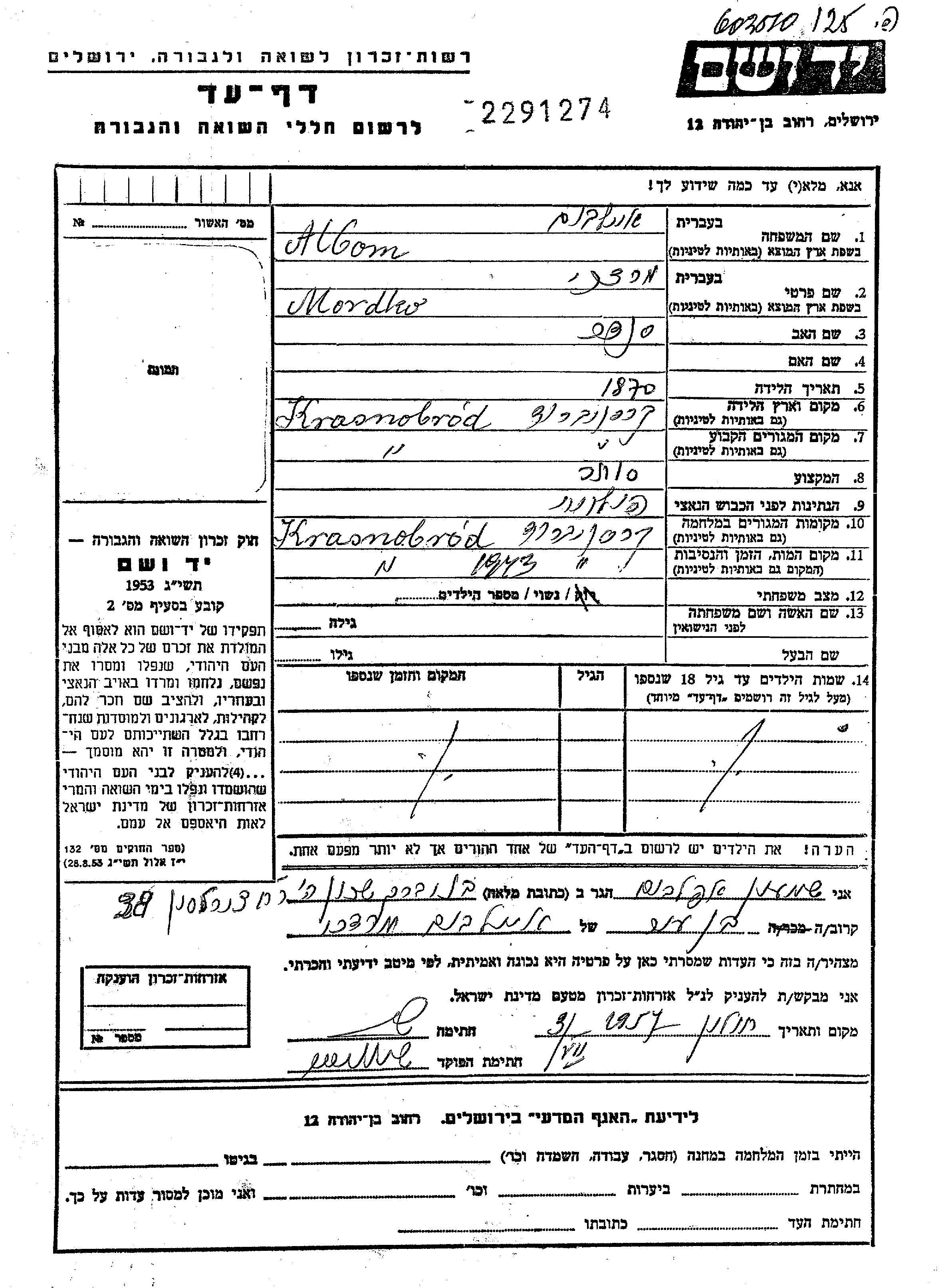 Mordko wurde in der Schoah ermordet. Todesort: Krasnobrod, Polen im Jahr 1943.