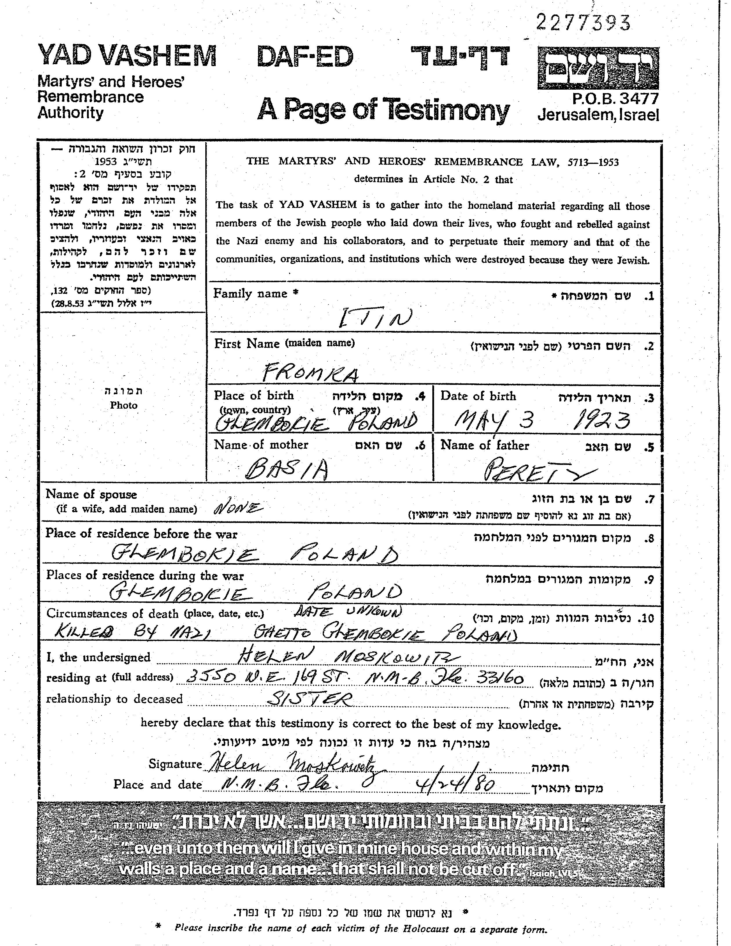 Fromka Itin wurde im Jahr 1923 in Glembokie, Polen geboren. Er war der Sohn von Peretz und Basia, geb. Tilles. Er war Ledig. Vor dem Zweiten Weltkrieg lebte er in Glembokie, Polen. Während des Krieges war er in Glembokie, Polen.