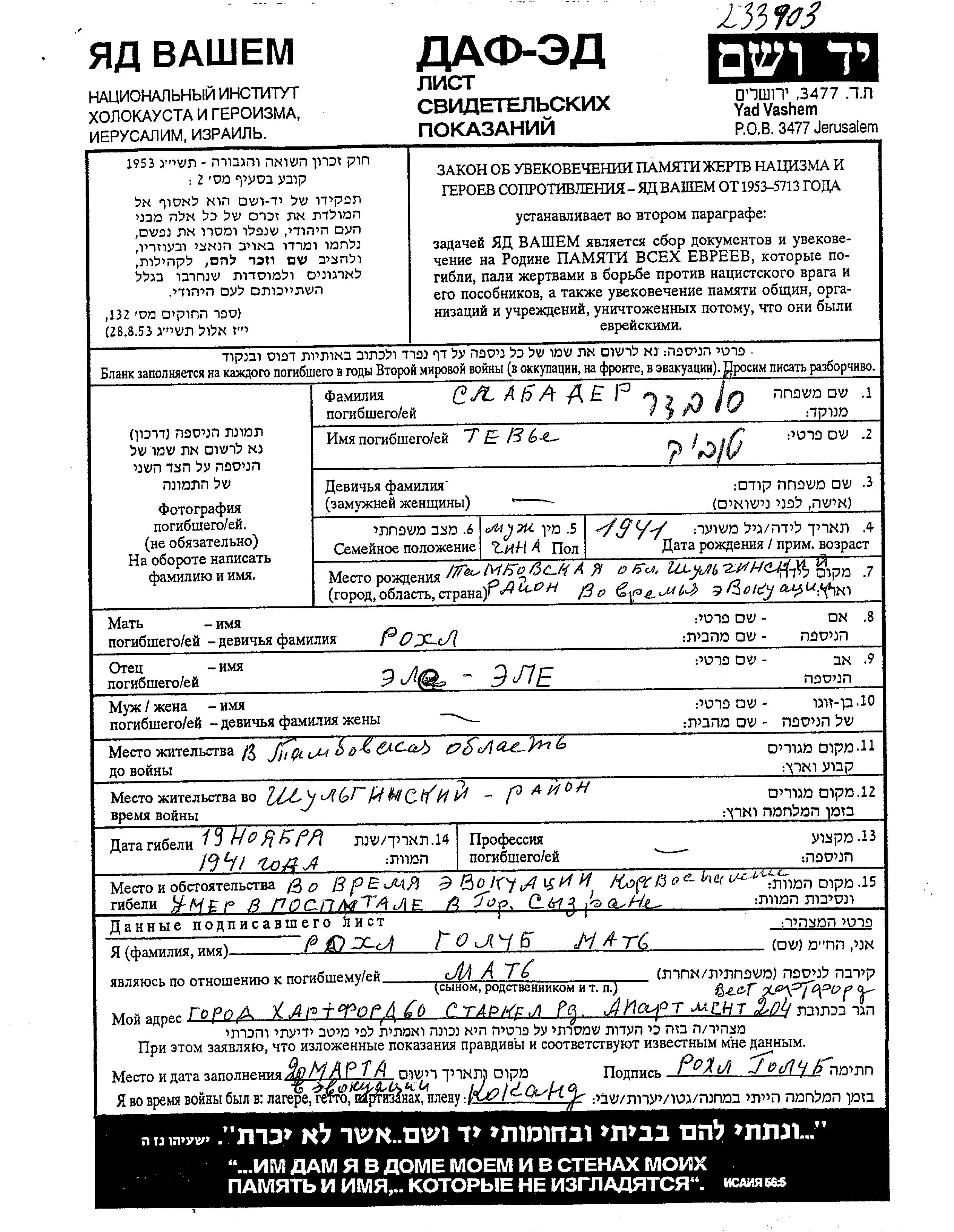 Tevye wurde in der Schoah ermordet. Todesort: Syzran, Russland (UdSSR) im Jahr 19/11/1941.