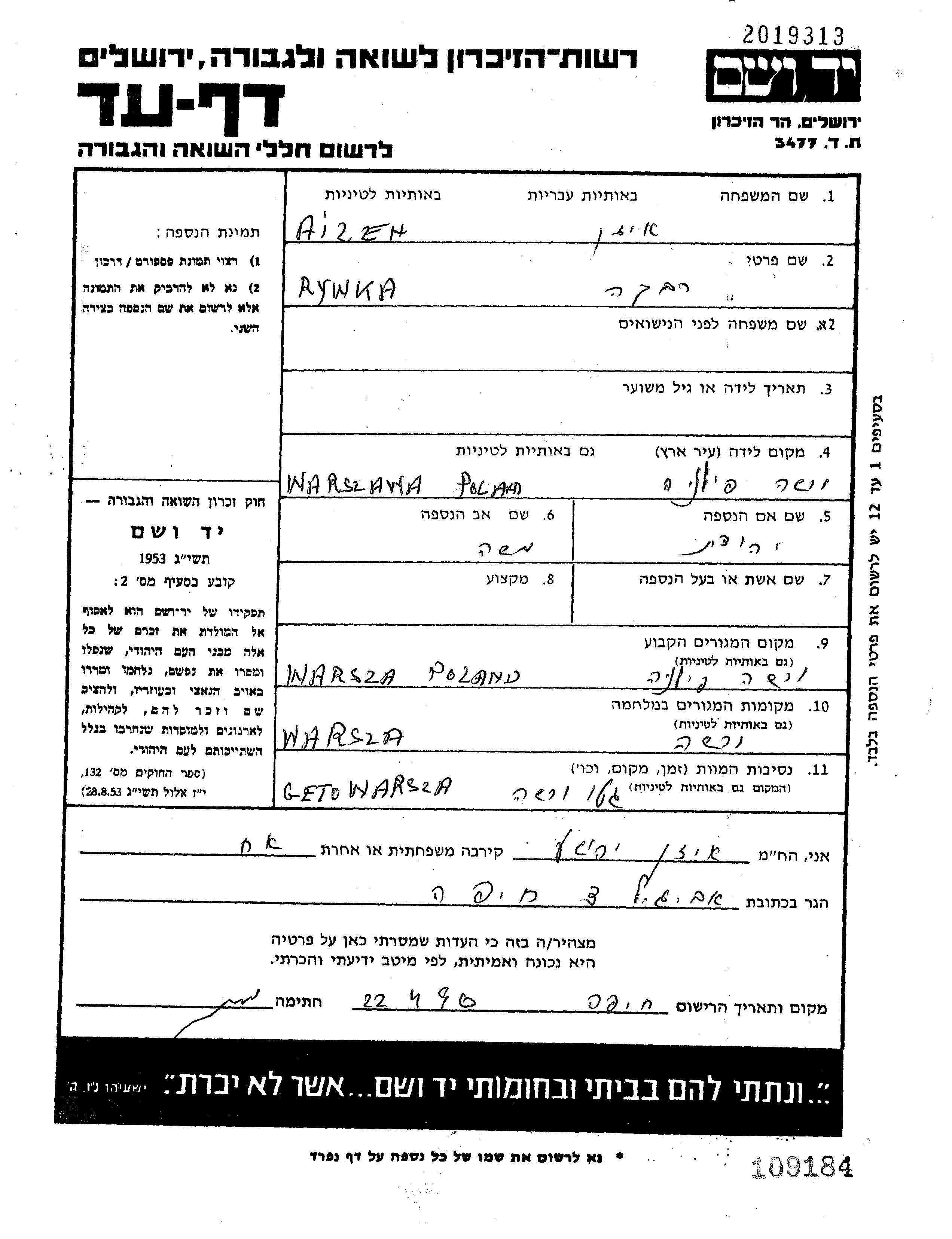 Aizen Rywka Warszawa, Polen Gedenkblatt