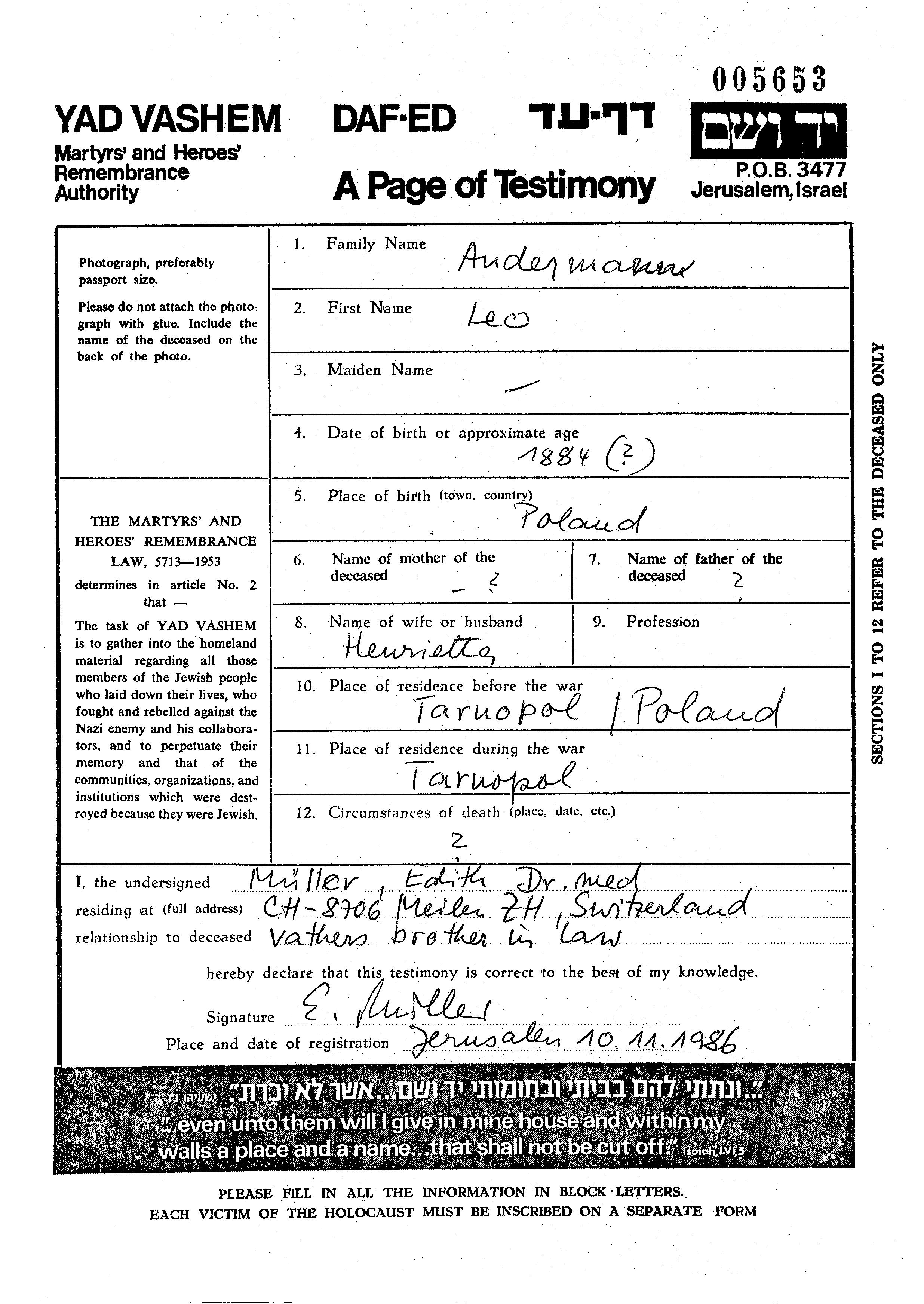 Leo Andermann wurde im Jahr 1884 in Polen geboren. Er war mit Henrietta Verheiratet. Vor dem Zweiten Weltkrieg lebte er in Tarnopol, Polen. Während des Krieges war er in Tarnopol, Polen.