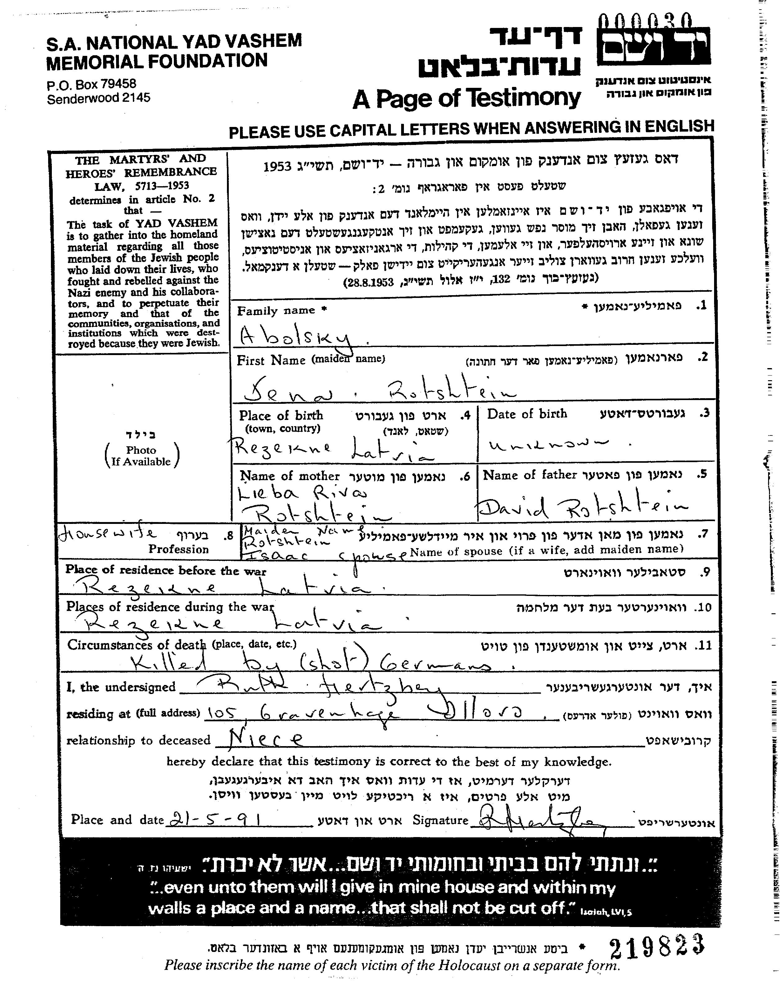 Jena Yana Abolsky Abolski, geb. Rotshtein wurde in Rēzekne, Lettland geboren. Sie war die Tochter von David und Lieba Riva. Sie war Hausfrau und mit Isaak Verheiratet. Vor dem Zweiten Weltkrieg lebte sie in Rēzekne, Lettland. Während des Krieges war sie in Rēzekne, Lettland.