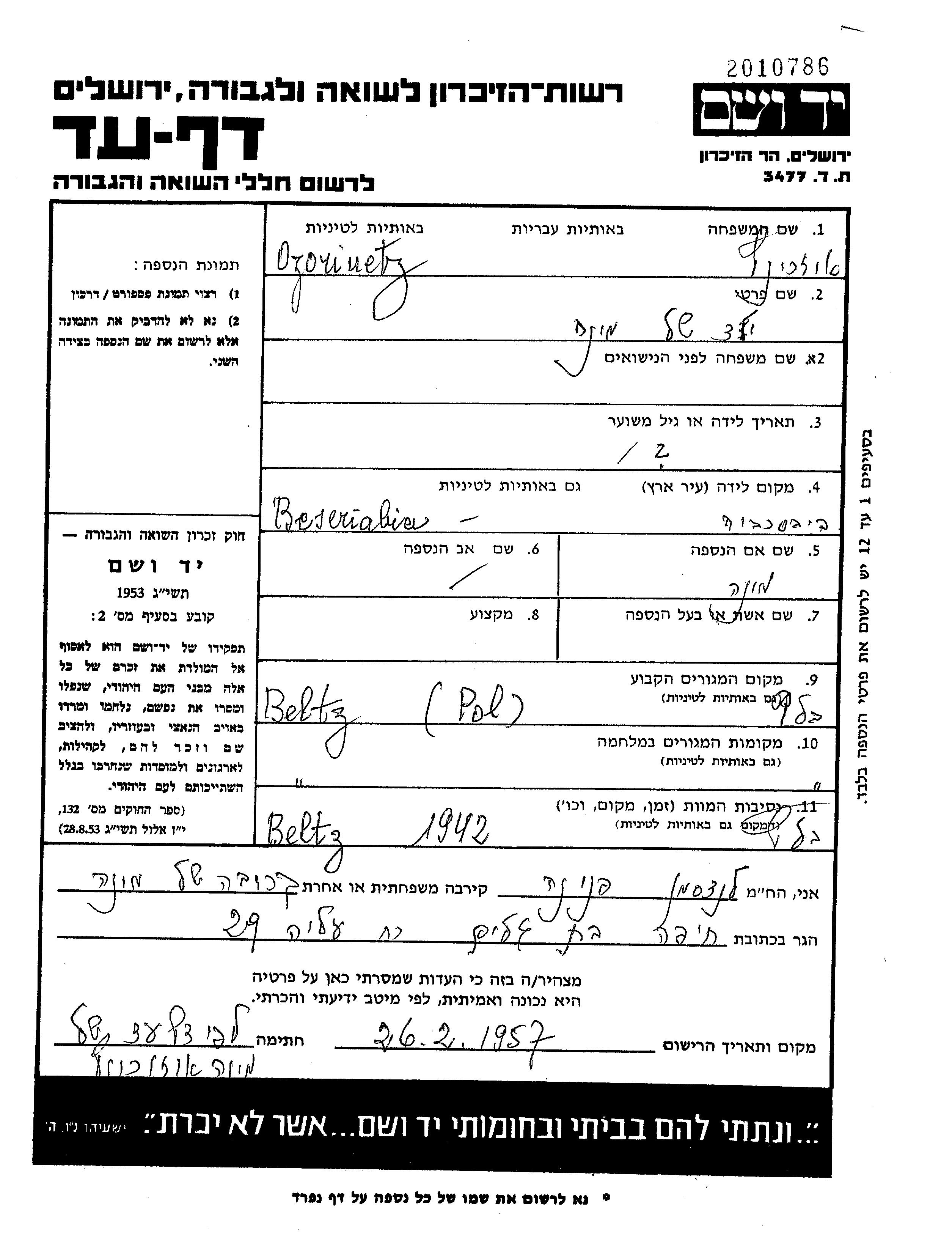 Vorname unbekannt Ozorinetz wurde in Bessarabia, Rumänien geboren. Er war der Sohn von Mina. Vor dem Zweiten Weltkrieg lebte er in Beltz, Rumänien. Während des Krieges war er in Beltz, Rumänien.