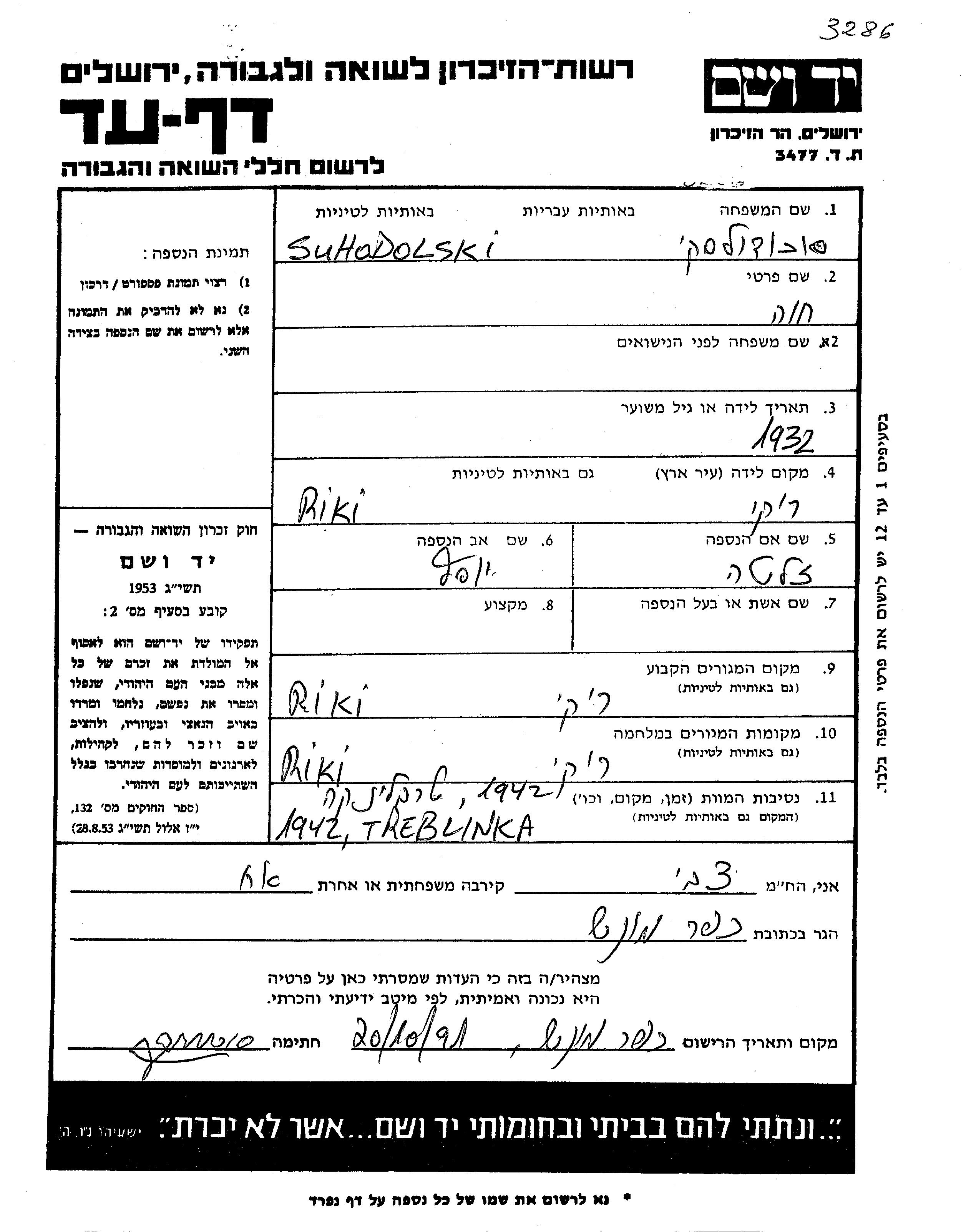 Khava Suhodolski wurde im Jahr 1932 in Ryki, Polen geboren. Sie war die Tochter von Yosef und Zlate, geb. Kalina. Sie war Kind. Vor dem Zweiten Weltkrieg lebte sie in Ryki, Polen. Während des Krieges war sie in Ryki, Polen.