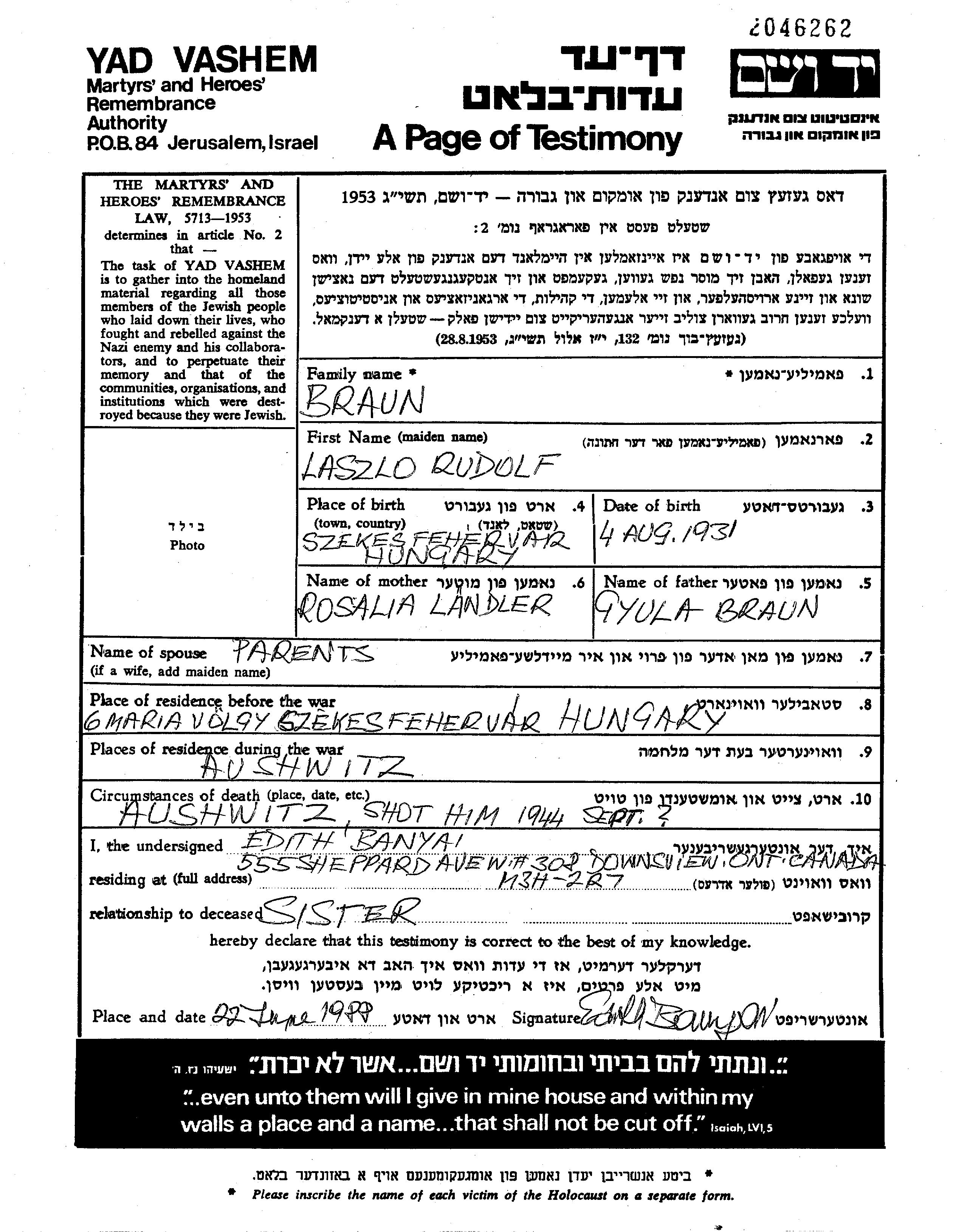 Laszlo Rudolf Braun wurde im Jahr 1931 in Szekesfehervar, Ungarn geboren. Er war der Sohn von Gyula und Rosalia, geb. Ländler. Er war Kind. Vor dem Zweiten Weltkrieg lebte er in Szekesfehervar, Ungarn.
