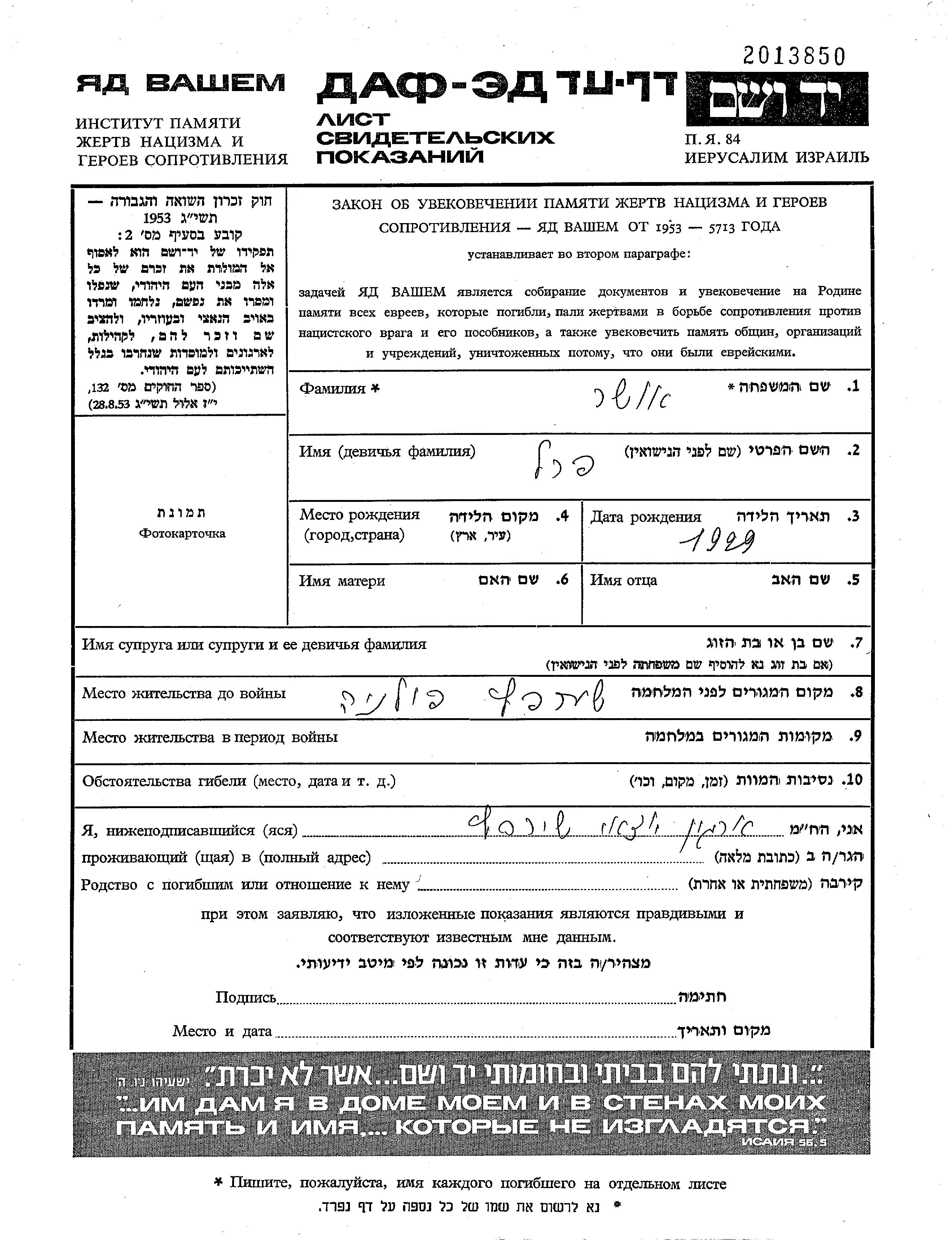 Oser Perl 1929 Sierpc, Polen Gedenkblatt