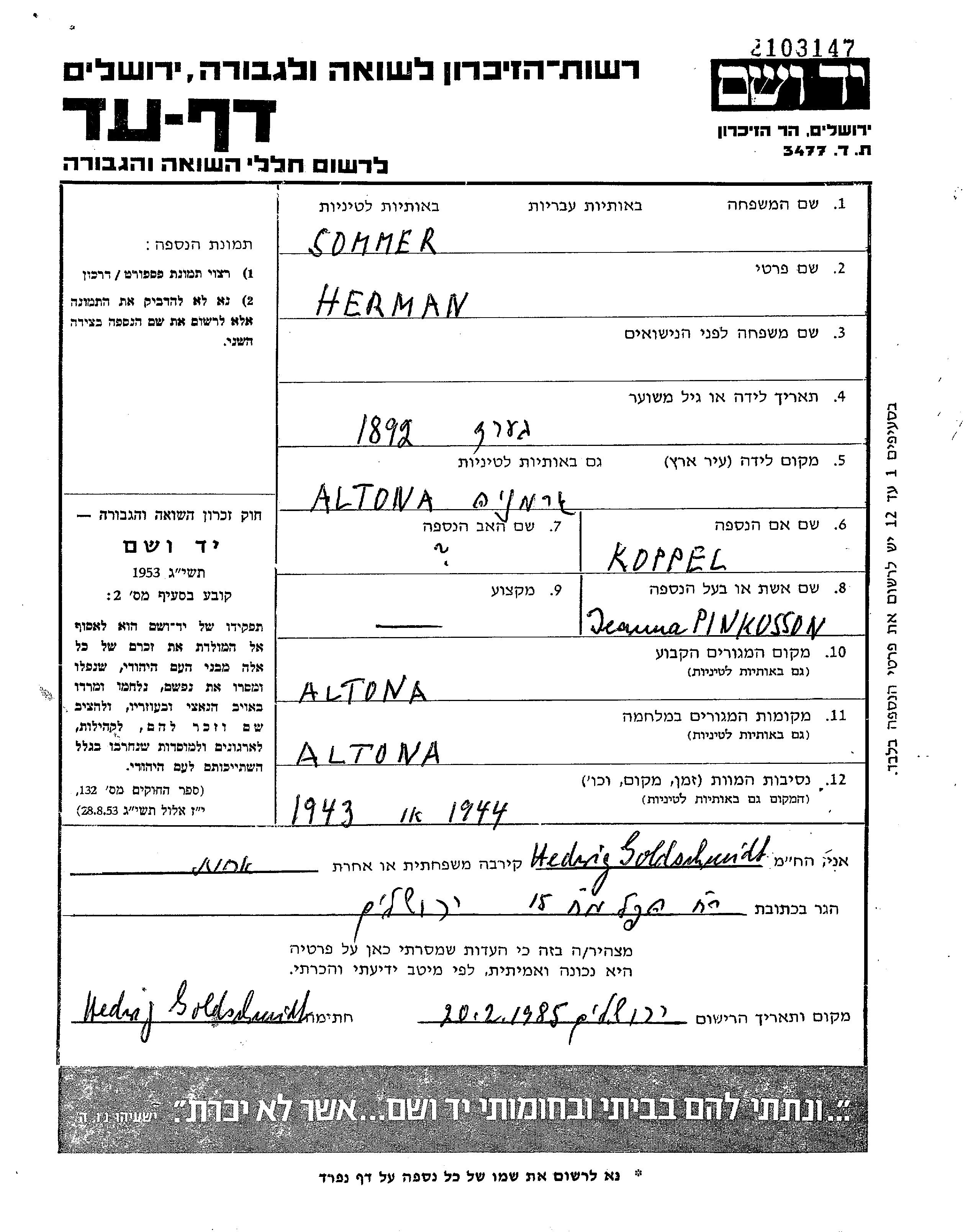 Herman Sommer wurde im Jahr 1892 in Altona, Deutsches Reich geboren. Er war der Sohn von Koppel. Er war mit Jeanna, geb. Pinkosson Verheiratet. Vor dem Zweiten Weltkrieg lebte er in Altona, Deutsches Reich. Während des Krieges war er in Altona, Deutsches Reich.