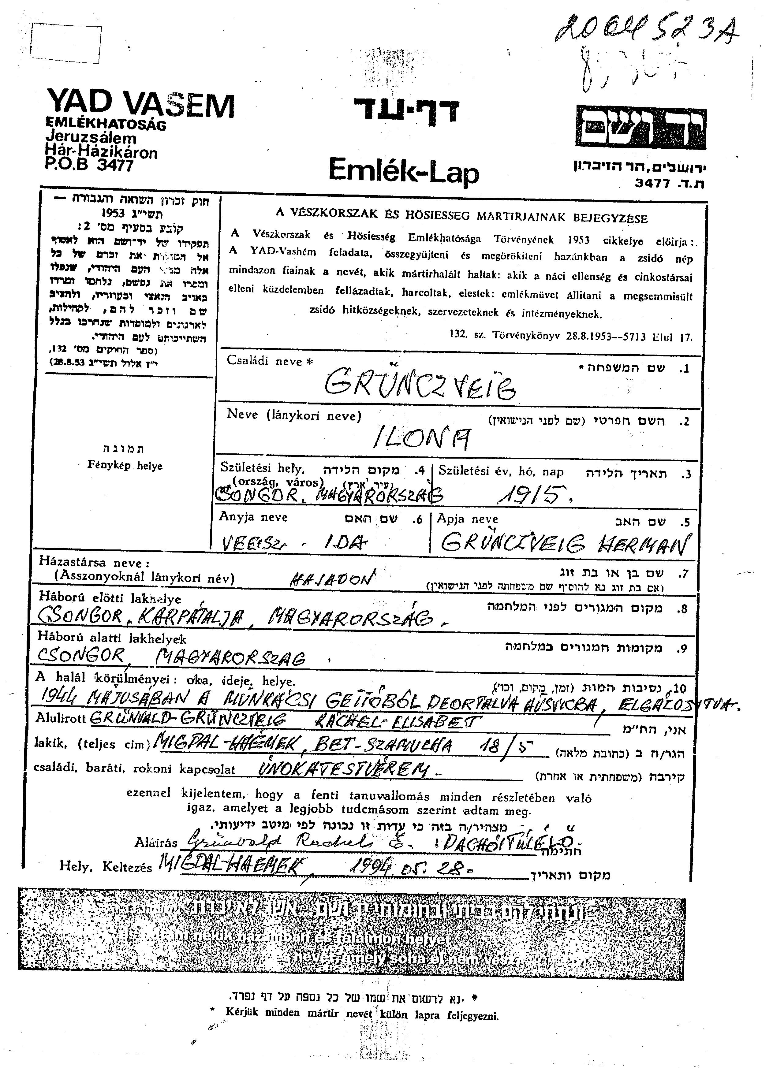 Ilona Grunczveig wurde im Jahr 1915 in Csongor, Tschechoslowakei geboren. Sie war die Tochter von Herman und Ida. Vor dem Zweiten Weltkrieg lebte sie in Csongor, Tschechoslowakei. Während des Krieges war sie in Csongor, Tschechoslowakei.