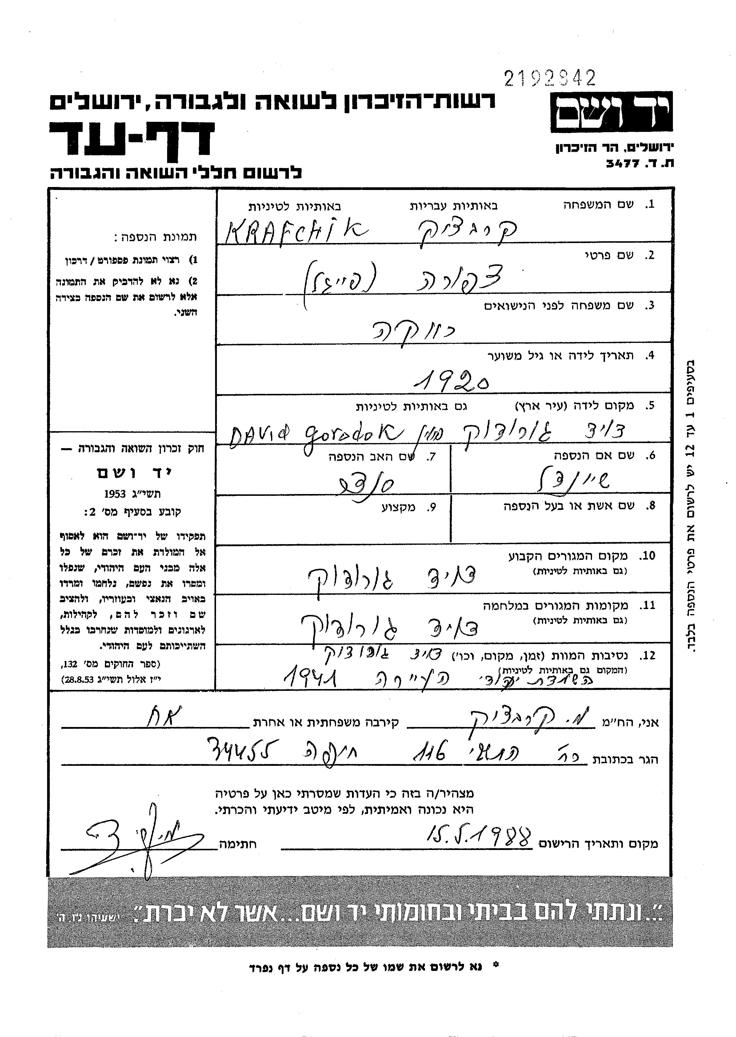Faigel Tzipora Krafchik wurde im Jahr 1920 in Dawidgrodek, Polen geboren. Sie war die Tochter von Sender und Sheindl, geb. Khefetz. Sie war Ledig. Vor dem Zweiten Weltkrieg lebte sie in Dawidgrodek, Polen. Während des Krieges war sie in Dawidgrodek, Polen.