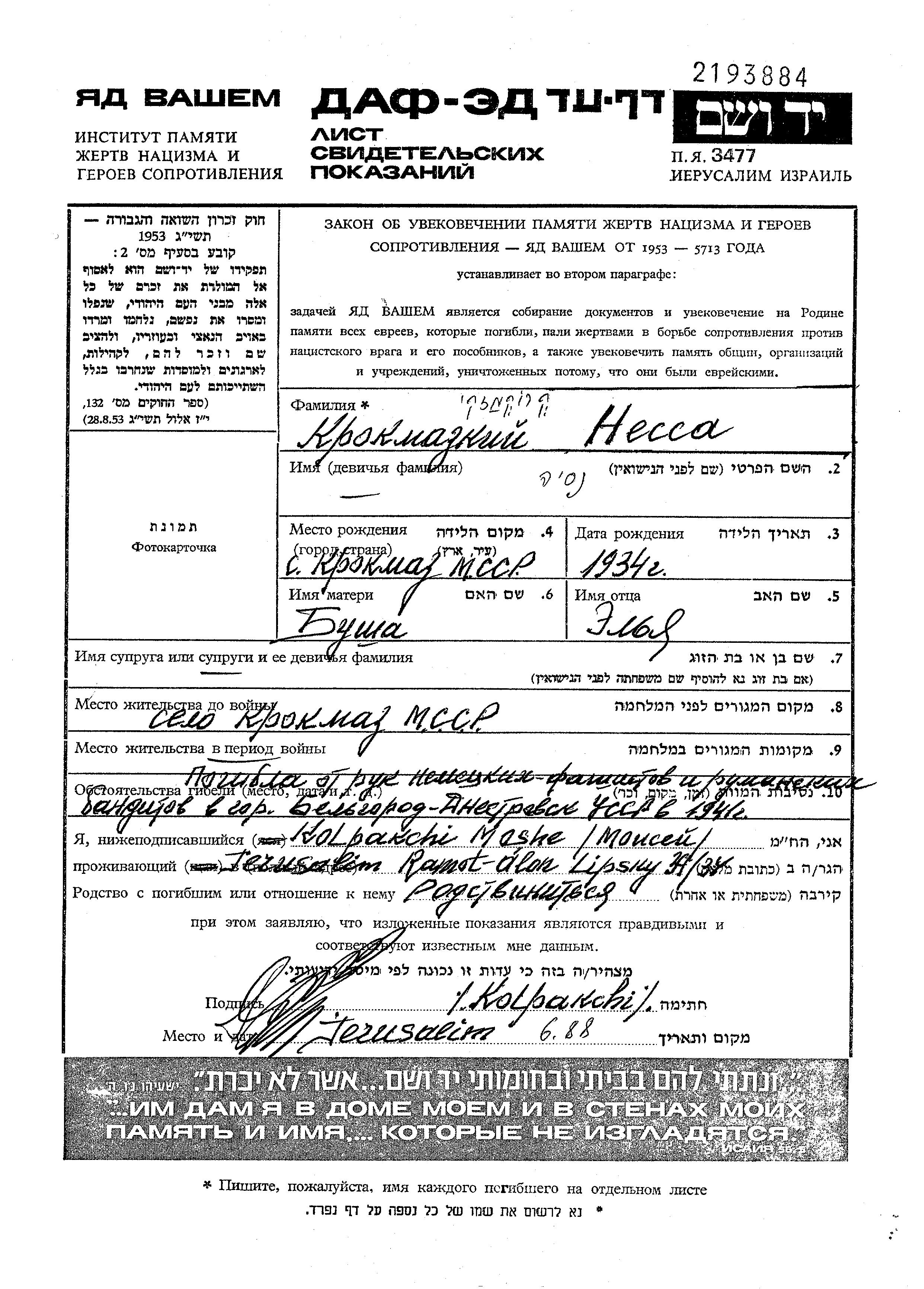 Nesa Krokmazki wurde im Jahr 1934 in Corcmaz, Rumänien geboren. Sie war die Tochter von Elia Alia und Busha, geb. Khaimovich. Sie war Kind. Vor dem Zweiten Weltkrieg lebte sie in Corcmaz, Rumänien. Während des Krieges war sie in Corcmaz, Rumänien.