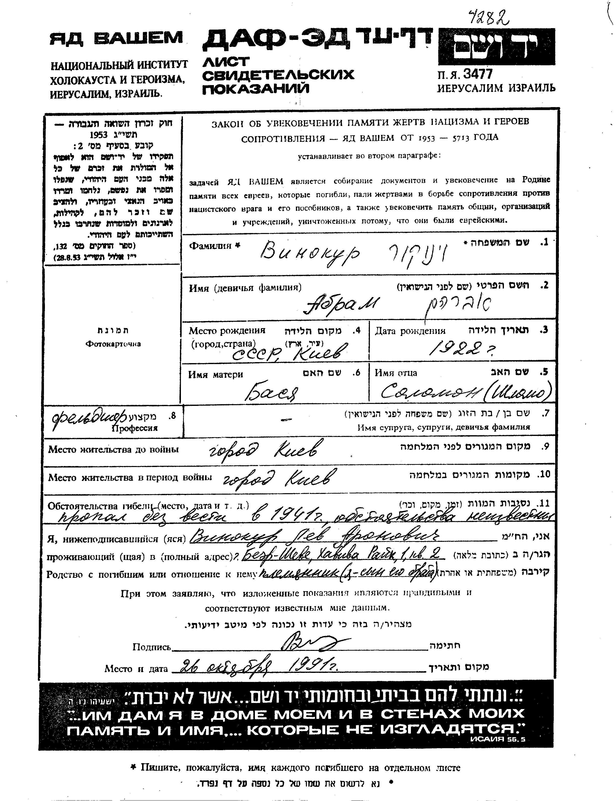 Abram Vinokur wurde im Jahr 1922 in Kiyev, Ukraine (UdSSR) geboren. Er war der Sohn von Solomon und Basia. Er war Krankenpfleger/-in. Vor dem Zweiten Weltkrieg lebte er in Kiyev, Ukraine (UdSSR). Während des Krieges war er in Kiyev, Ukraine (UdSSR).