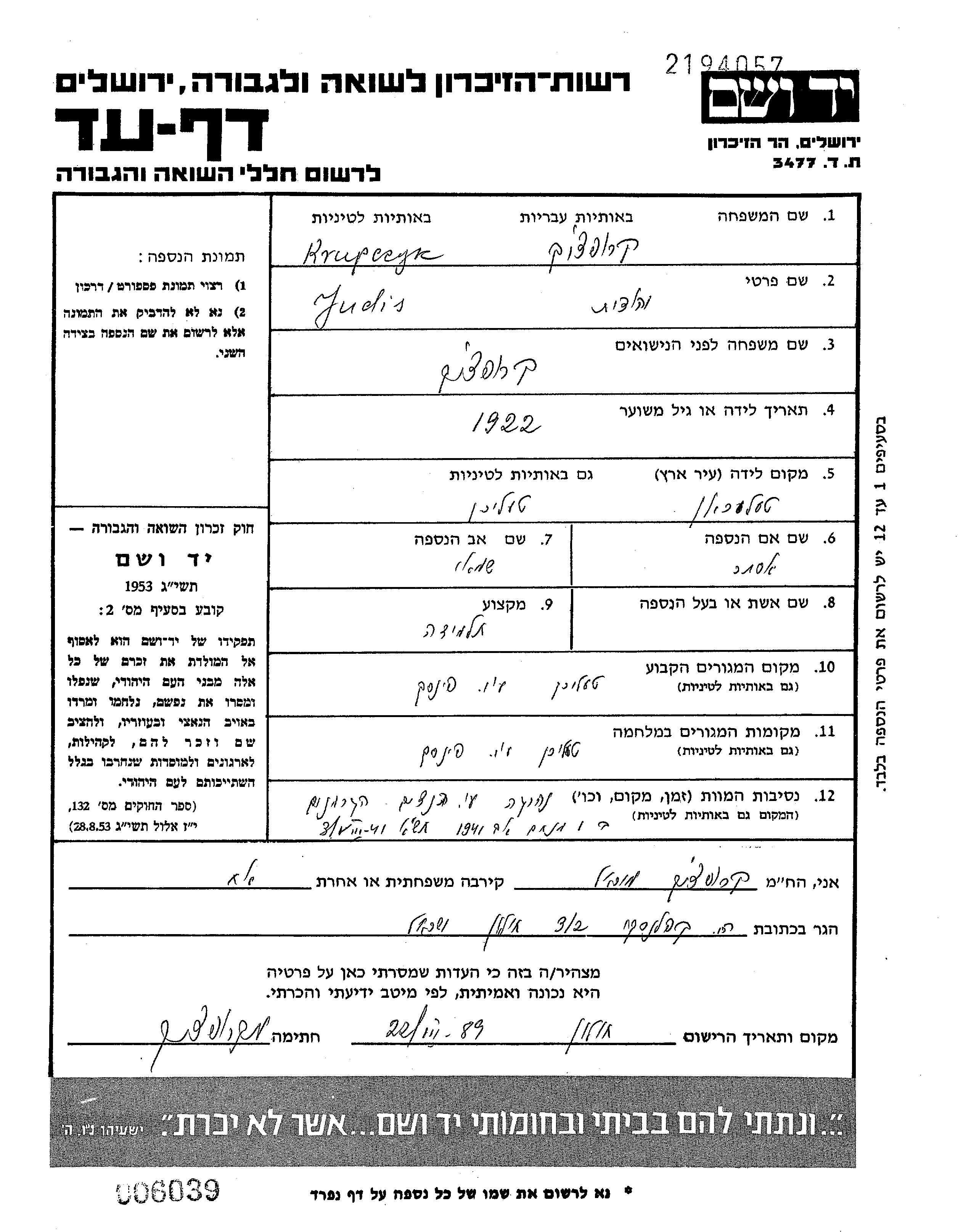 Judis Krupczyk wurde im Jahr 1922 in Telechany, Polen geboren. Sie war die Tochter von Shamai und Ester, geb. Feldman. Sie war Schüler/-in und Ledig. Vor dem Zweiten Weltkrieg lebte sie in Telechany, Polen. Während des Krieges war sie in Telechany, Polen.