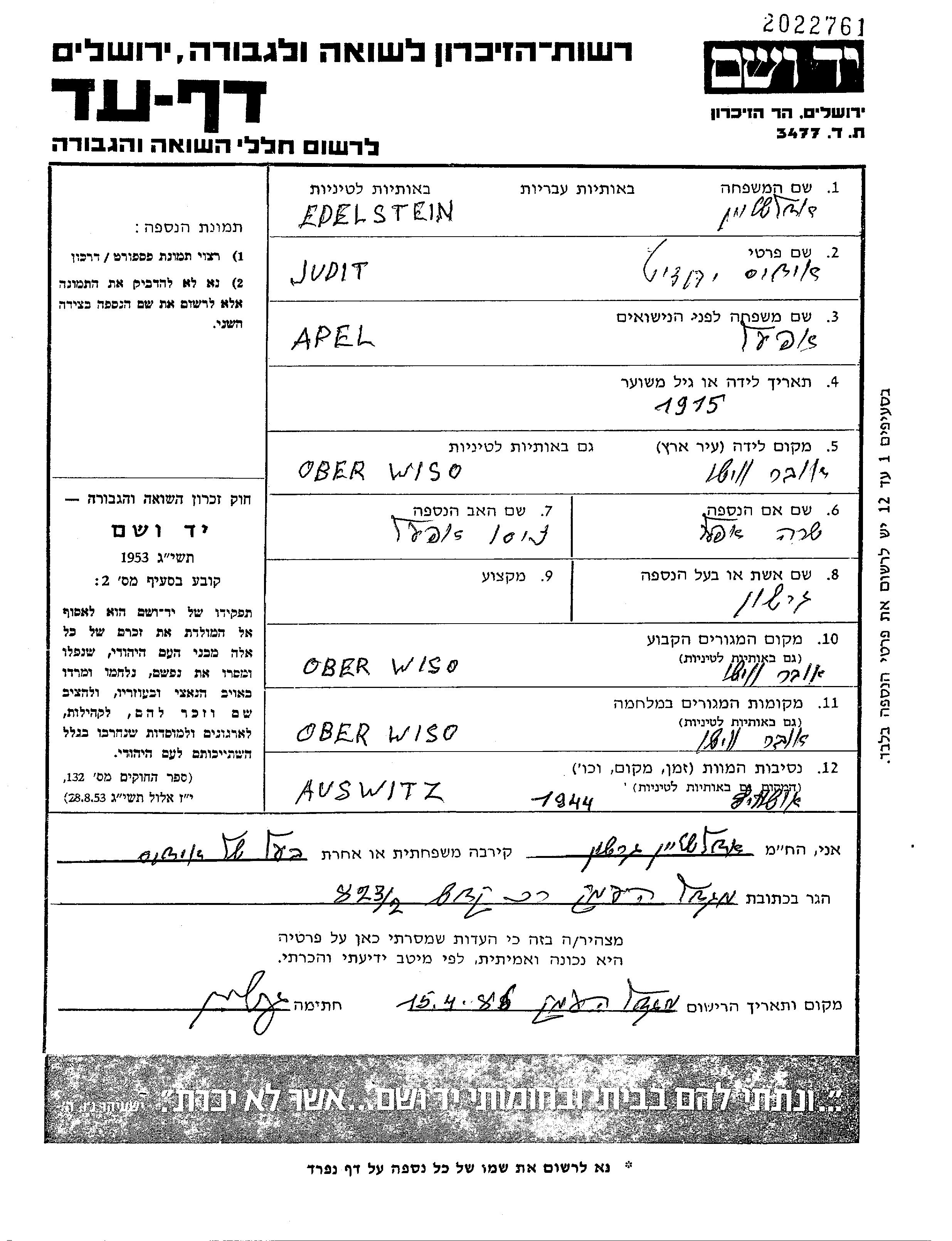 Judit Edelstein, geb. Apel wurde im Jahr 1915 in Ober Wischo, Rumänien geboren. Sie war die Tochter von Zisu und Sara. Sie war mit Gershon Verheiratet. Vor dem Zweiten Weltkrieg lebte sie in Ober Wischo, Rumänien. Während des Krieges war sie in Ober Wischo, Rumänien.