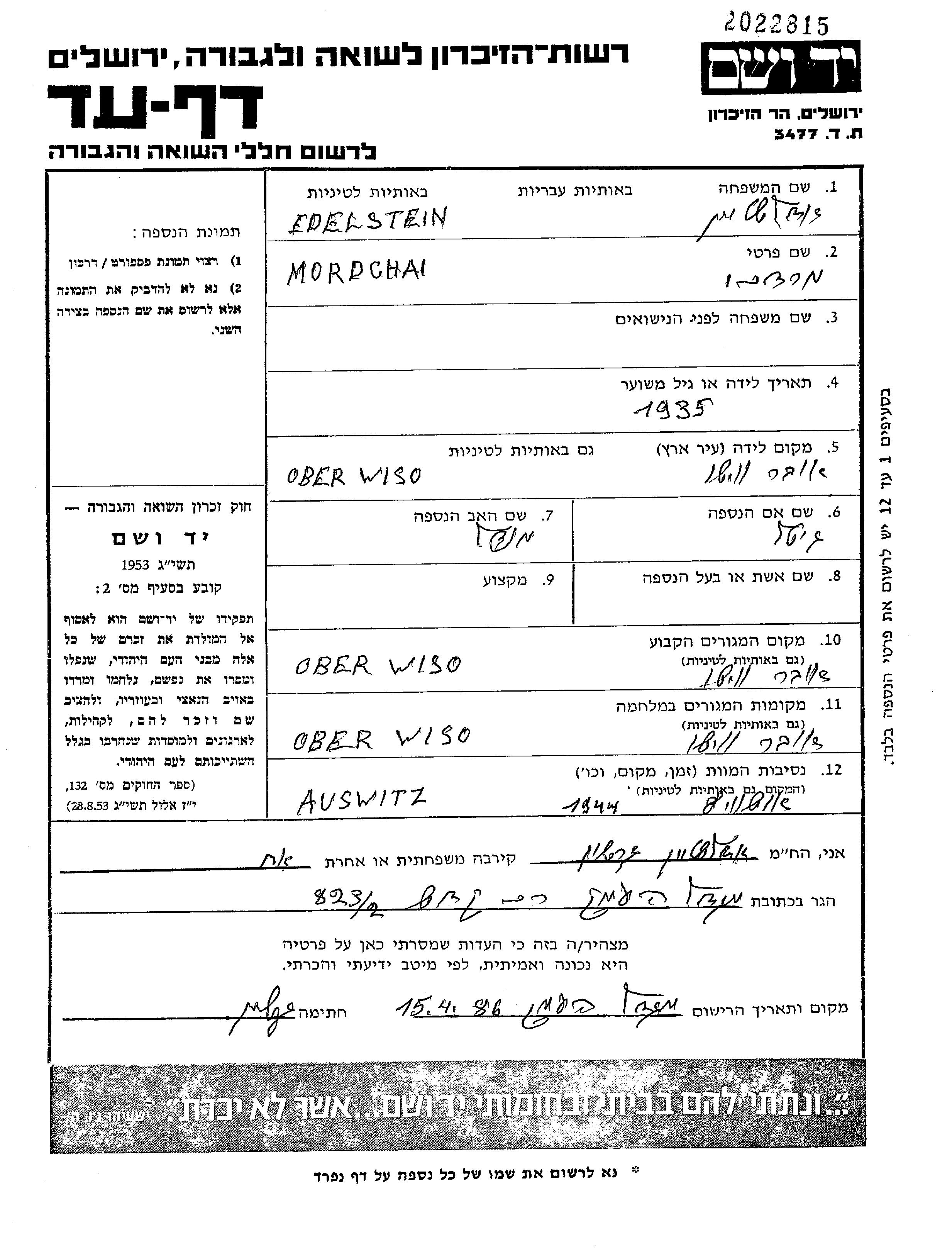Edelstein Mordchai 1935 Ober Wischo, Rumänien Gedenkblatt