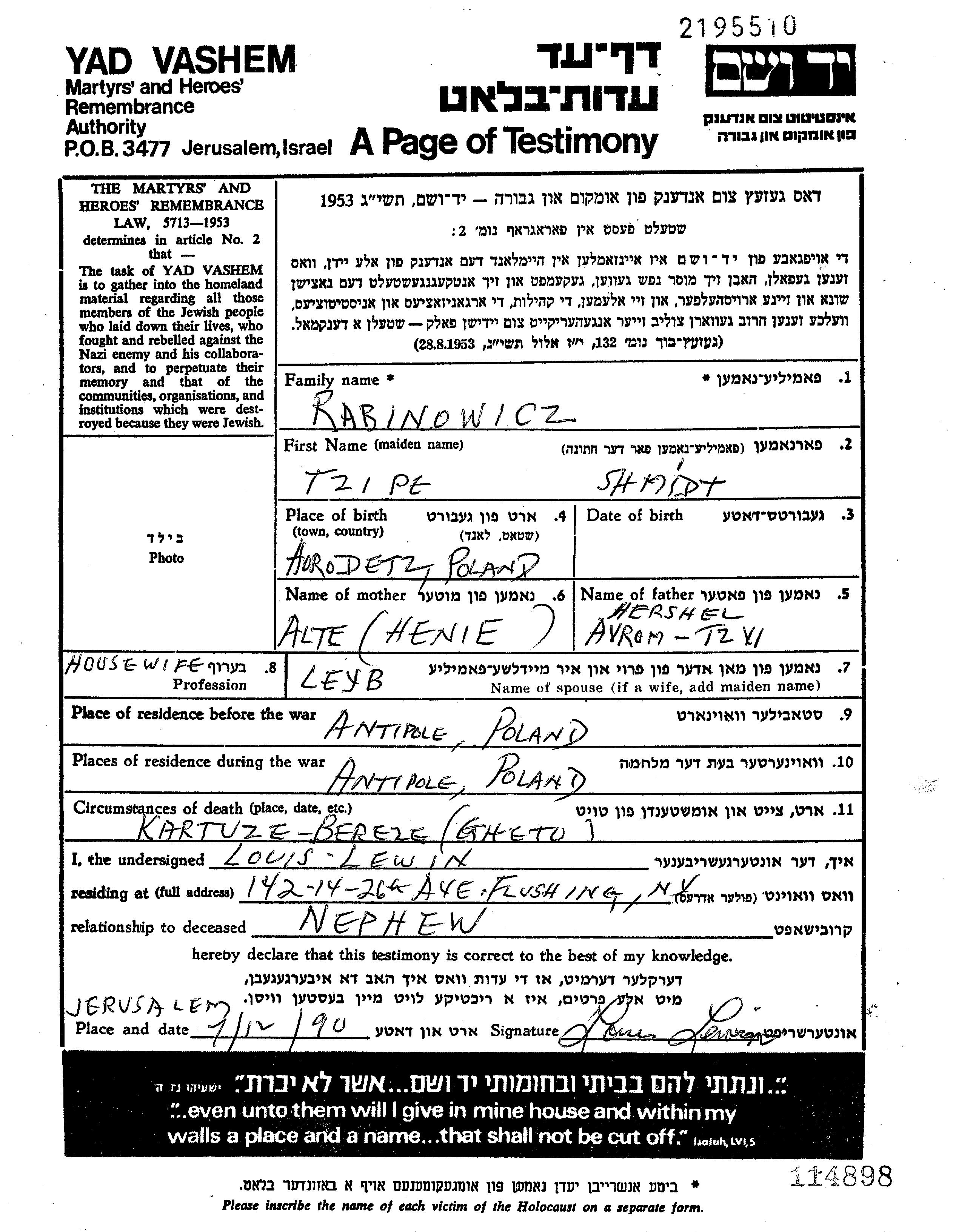Rabinowicz Tzipa Antipolye, Polen Gedenkblatt