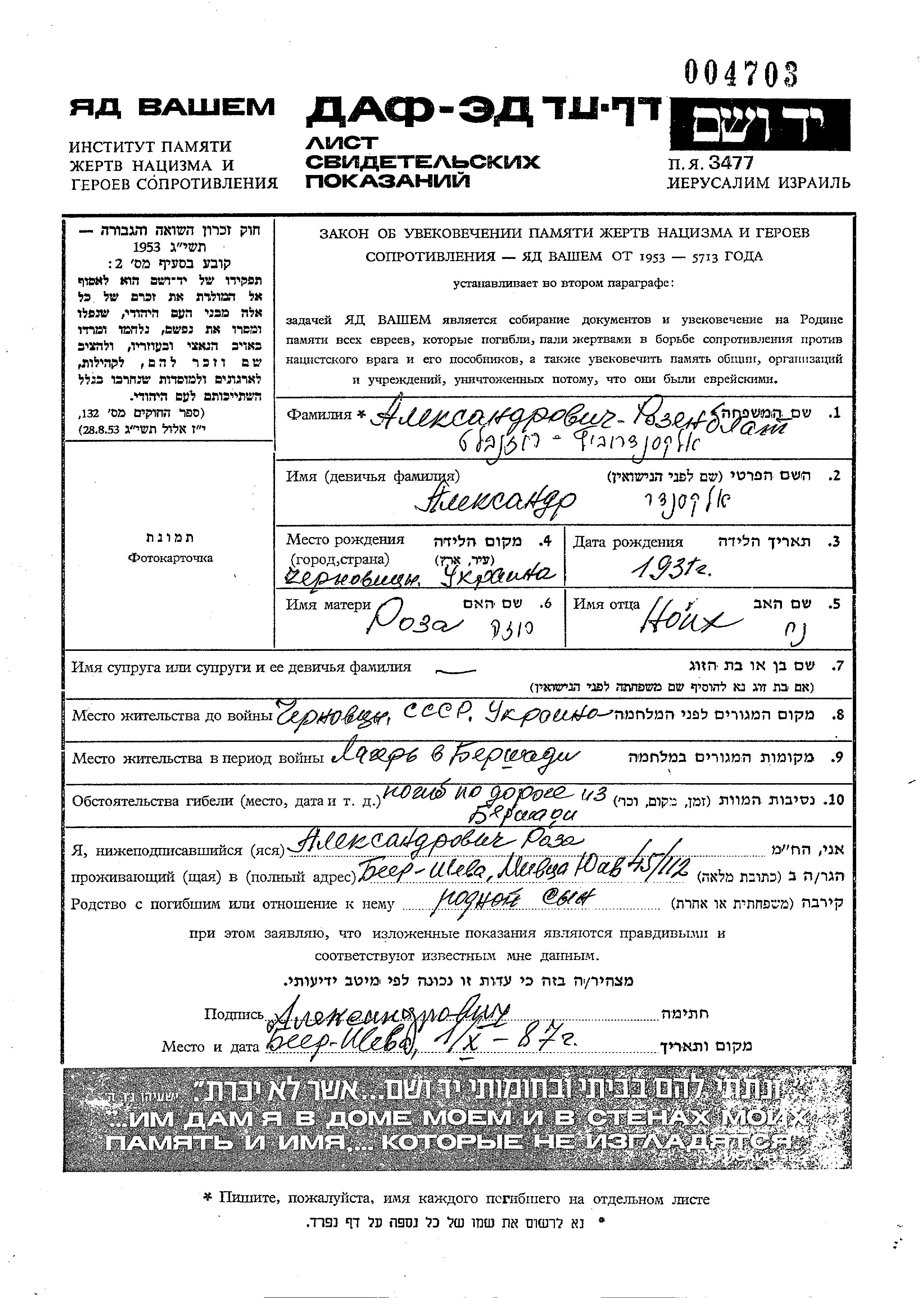 Aleksandrovich Rozenblat Aleksandr 1931 Czernowitz, Rumänien Gedenkblatt
