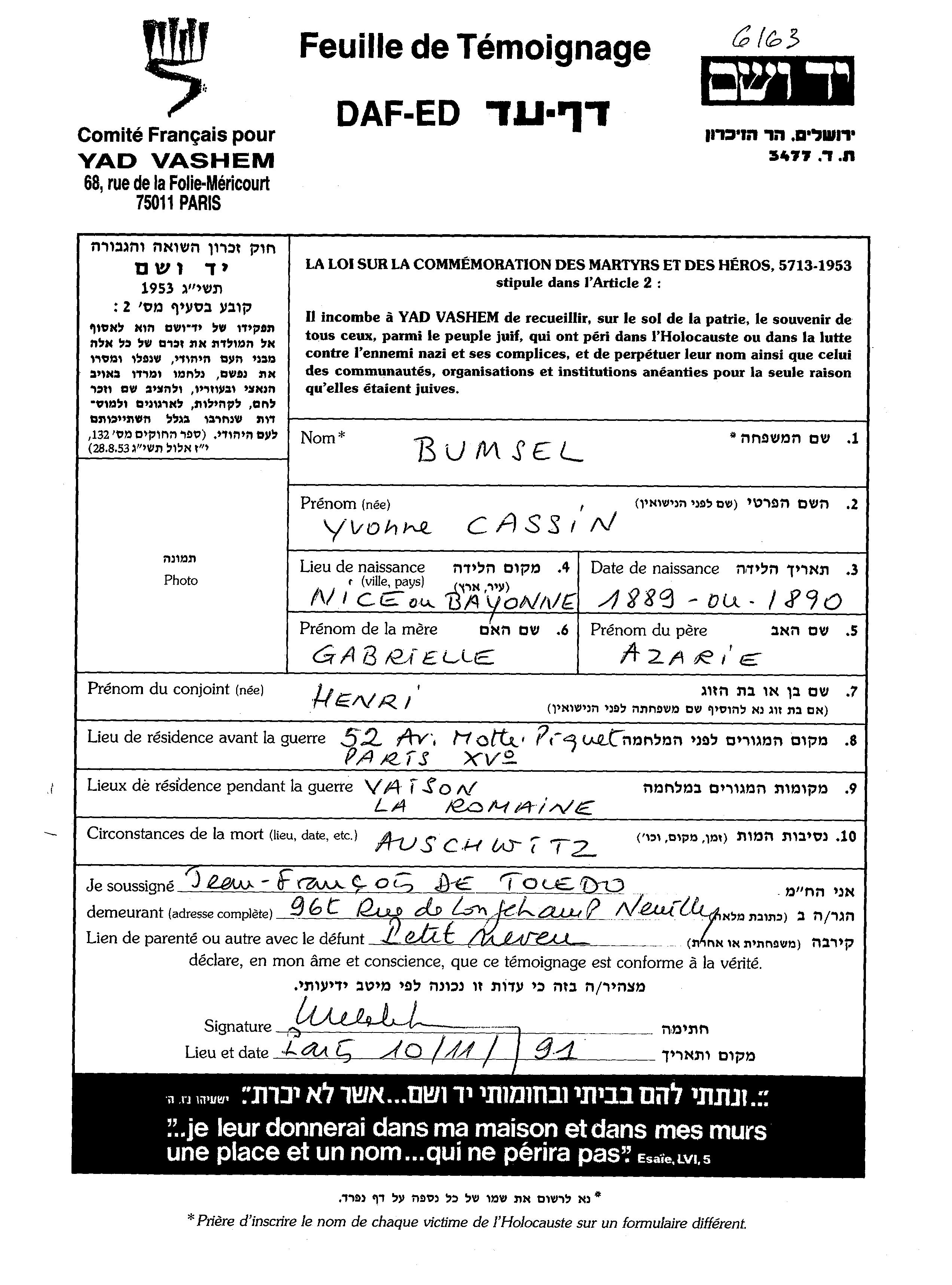 Yvonne Bumsel wurde im Jahr 1889 in Nice, Frankreich geboren. Sie war die Tochter von Azarie und Gabrielle. Sie war mit Henri Verheiratet. Vor dem Zweiten Weltkrieg lebte sie in Paris, Frankreich. Während des Krieges war sie in Vaison la Romaine, Frankreich.