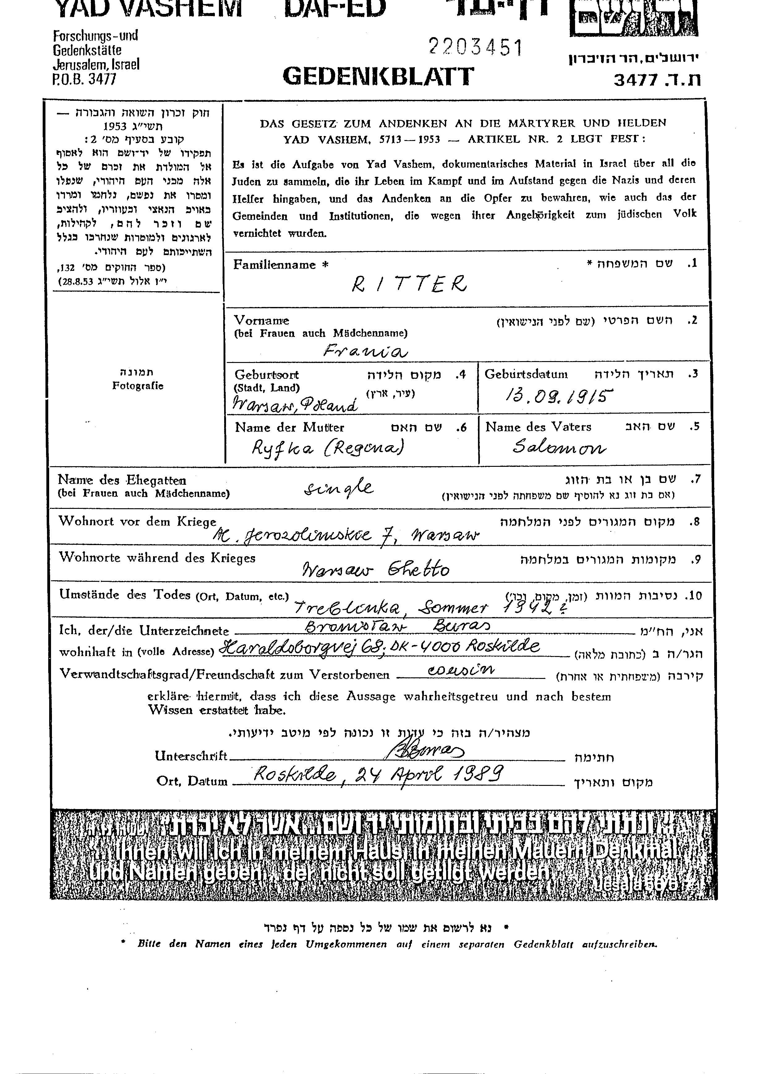 Frania Ritter wurde im Jahr 1915 in Warszawa, Polen geboren. Sie war die Tochter von Salomon und Ryfka Regina, geb. Glowiczower. Sie war Ledig. Vor dem Zweiten Weltkrieg lebte sie in Warszawa, Polen. Während des Krieges war sie in Warszawa, Polen.