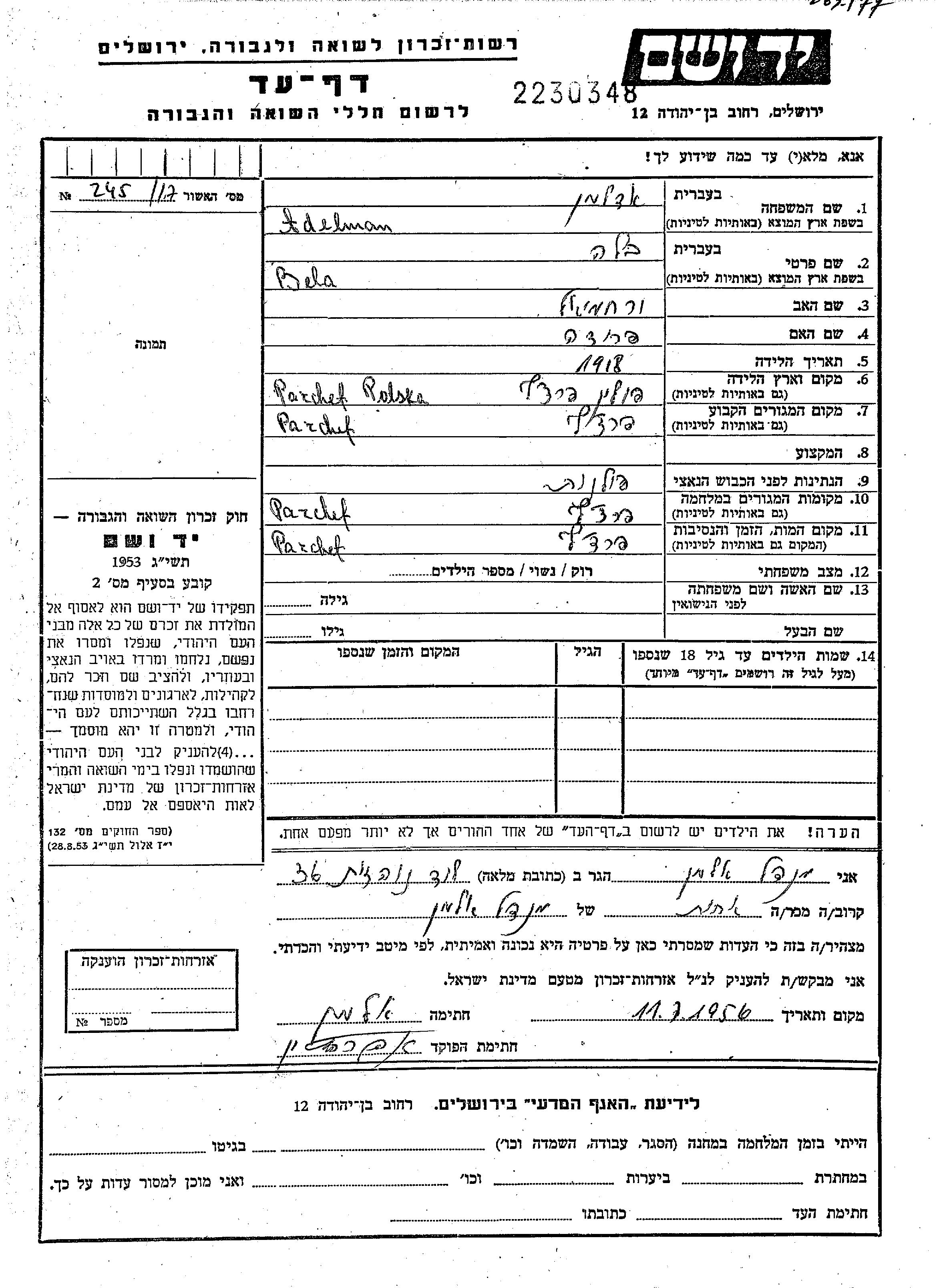 Bela Adelman wurde im Jahr 1918 in Parczew, Polen geboren. Er war der Sohn von Irakhmiel und Frida. Vor dem Zweiten Weltkrieg lebte er in Parczew, Polen. Während des Krieges war er in Parczew, Polen.