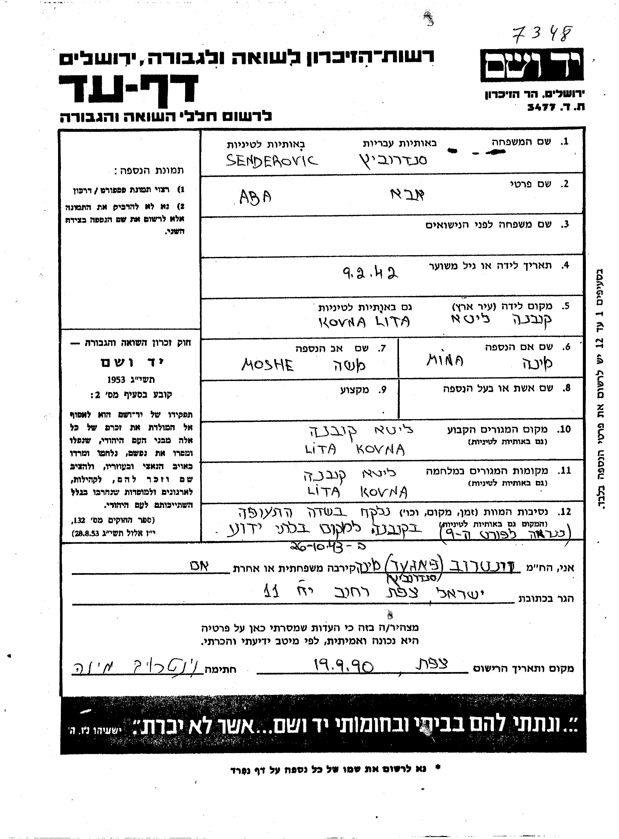 Senderovic Aba 1942 Kowno, Litauen Gedenkblatt