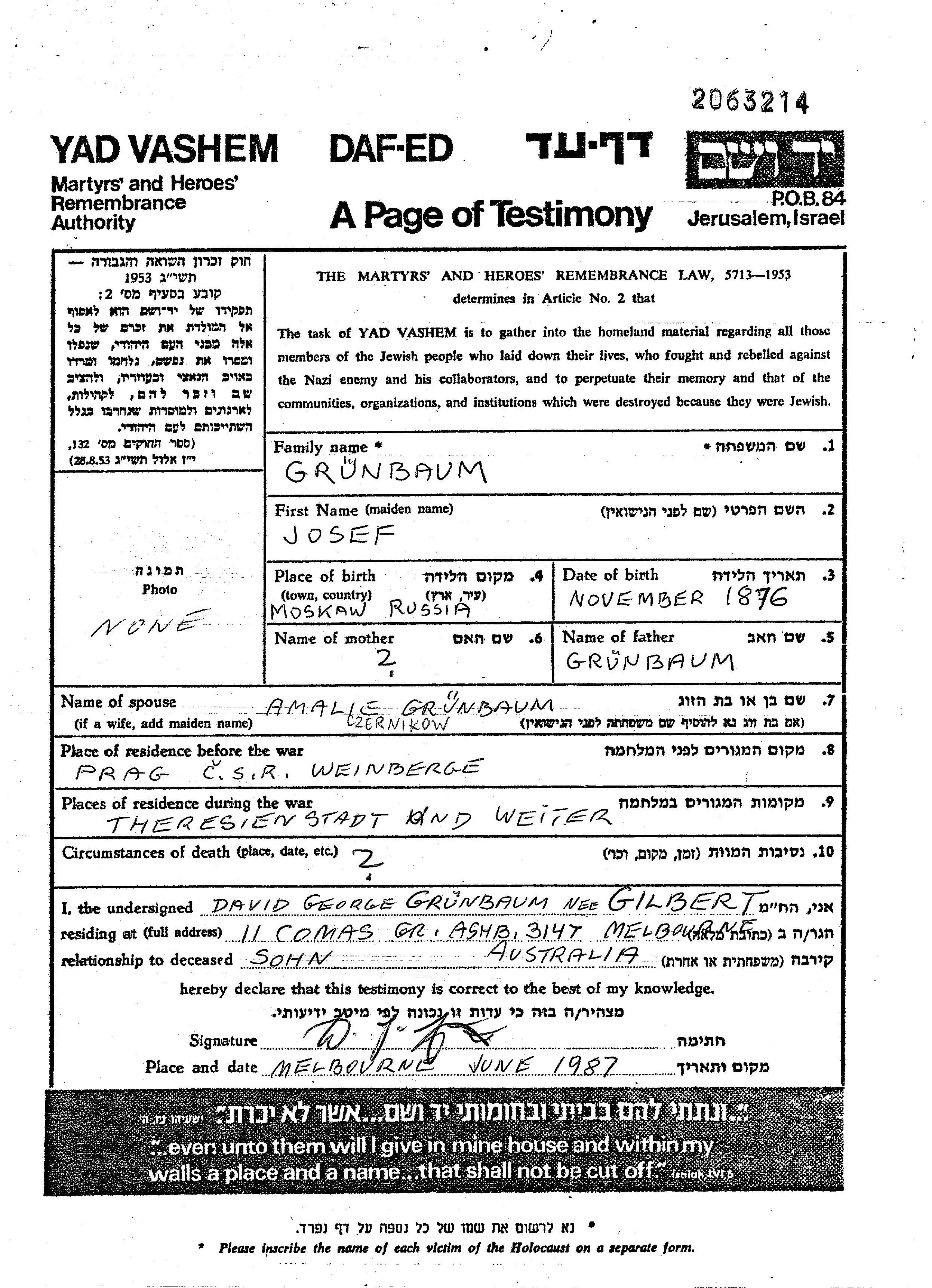 Josef Grünbaum wurde im Jahr 1876 in Moskva, Russland (UdSSR) geboren. Er war mit Amalie Verheiratet. Vor dem Zweiten Weltkrieg lebte er in Praha, Tschechoslowakei. Während des Krieges war er in Tschechoslowakei.