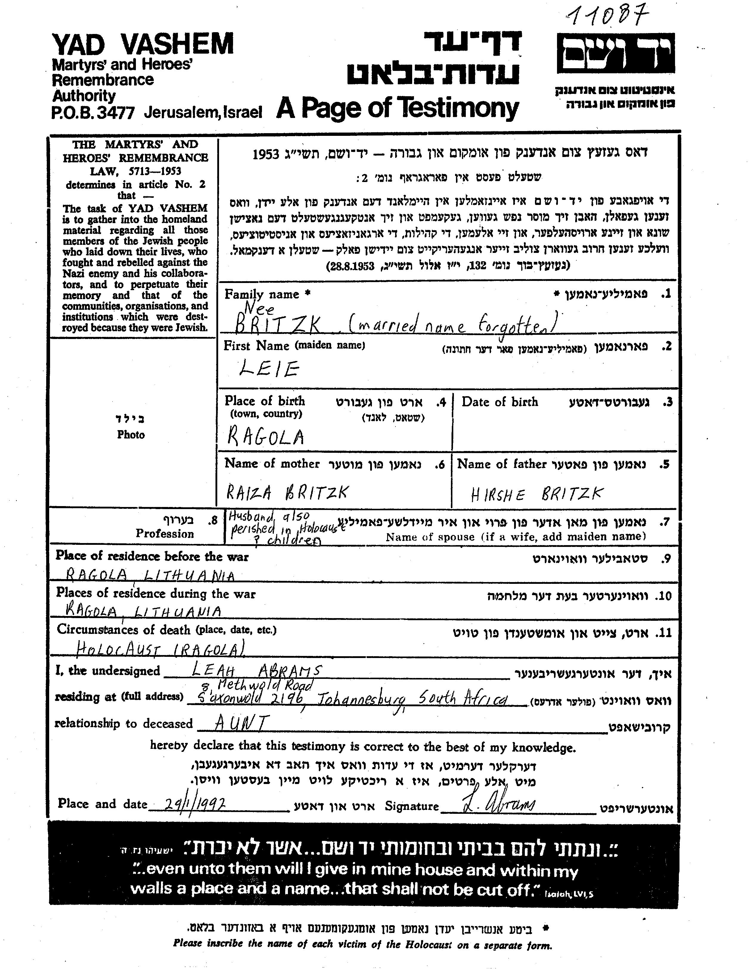 Leie Name unbekannt, geb. Britzk wurde in Ragola, Litauen geboren. Sie war die Tochter von Hirshe und Raiza, geb. Zalter. Sie war Verheiratet. Vor dem Zweiten Weltkrieg lebte sie in Ragola, Litauen. Während des Krieges war sie in Ragola, Litauen.