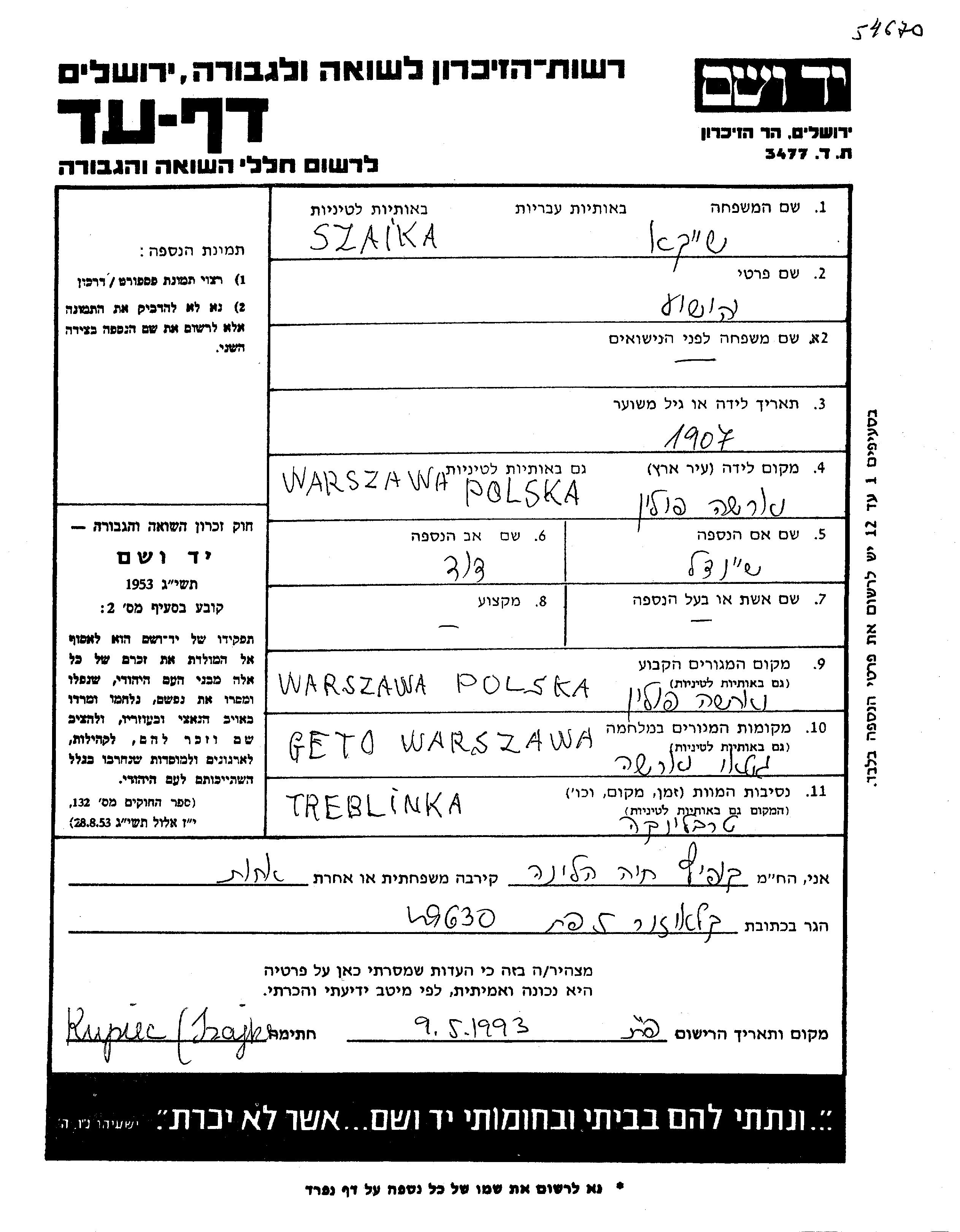 Yehoshua Szaika wurde im Jahr 1907 in Warszawa, Polen geboren. Er war der Sohn von David und Sheindl, geb. Mondash. Vor dem Zweiten Weltkrieg lebte er in Warszawa, Polen. Während des Krieges war er in Warszawa, Polen.