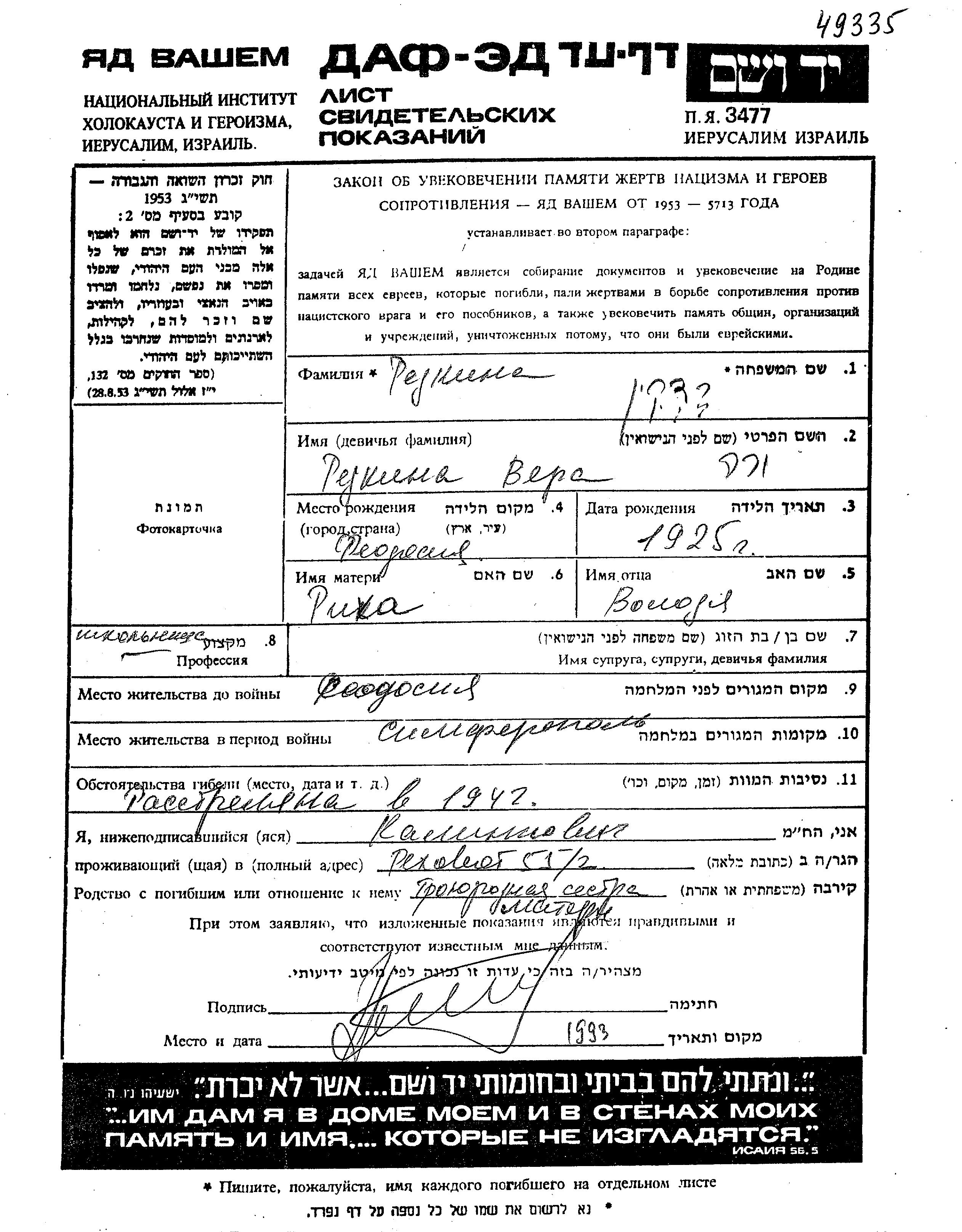 Vera Redkina wurde im Jahr 1925 in Feodosiya, Russland (UdSSR) geboren. Sie war die Tochter von Volodya und Rika, geb. Goldman. Sie war Schüler/-in und Kind. Vor dem Zweiten Weltkrieg lebte sie in Feodosiya, Russland (UdSSR). Während des Krieges war sie in Simferopol, Russland (UdSSR).