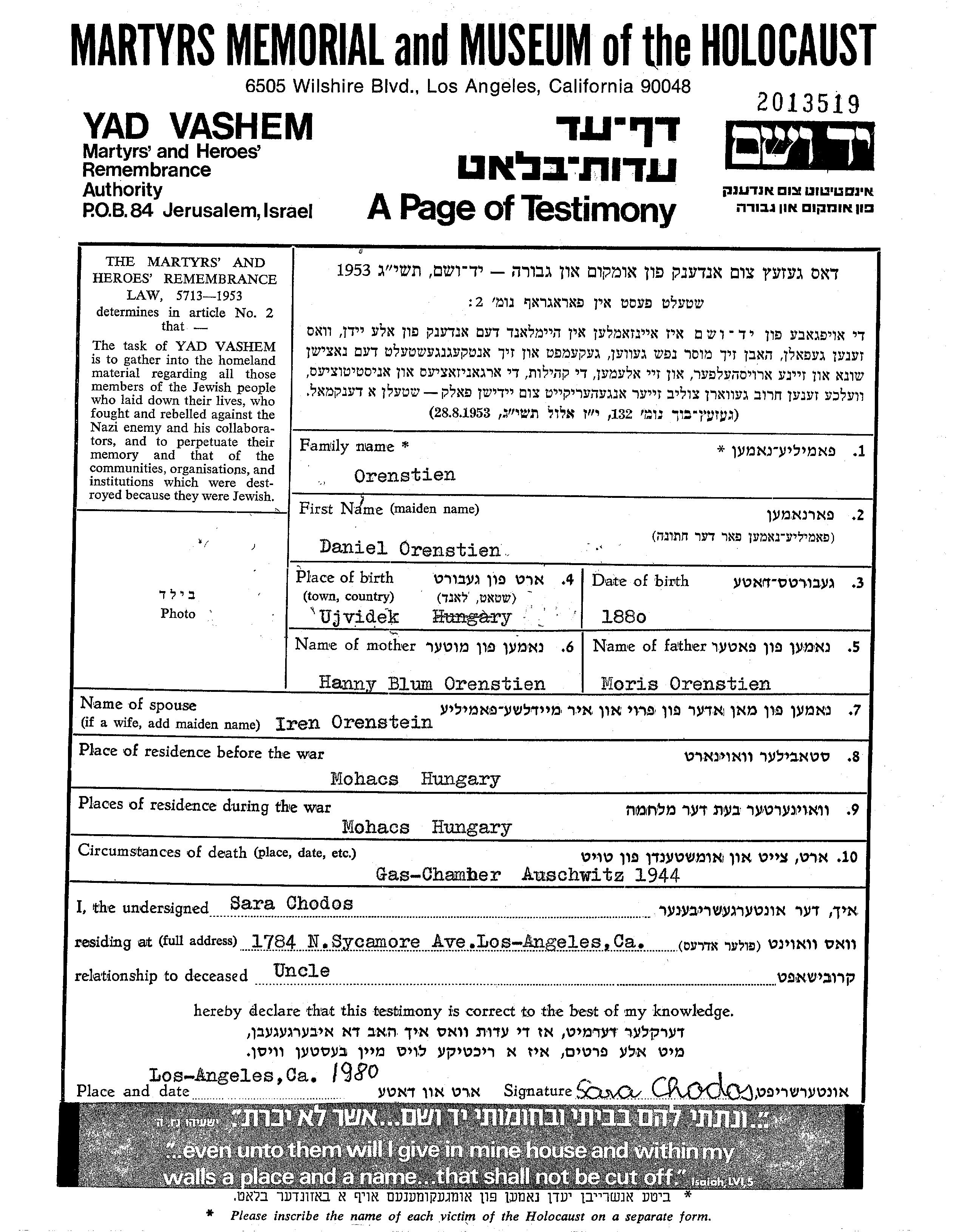 Daniel Orenstien wurde im Jahr 1880 in Ujvidek, Jugoslawien geboren. Er war der Sohn von Moris und Hanny, geb. Blum. Er war mit Iren Verheiratet. Vor dem Zweiten Weltkrieg lebte er in Mohacs, Ungarn. Während des Krieges war er in Mohacs, Ungarn.