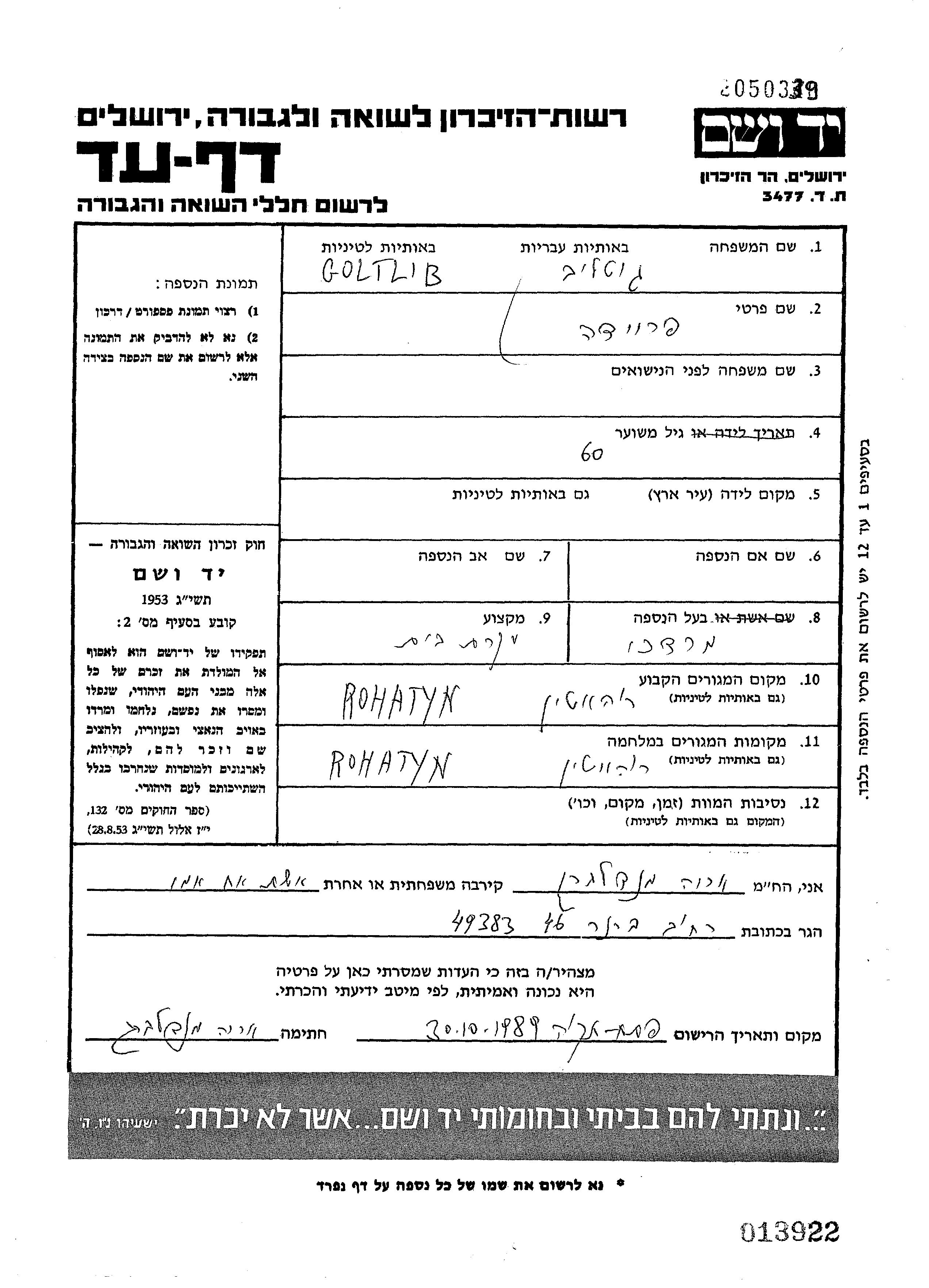 Freida Gottlib. Sie war Hausfrau und mit Mordekhai Verheiratet. Vor dem Zweiten Weltkrieg lebte sie in Rohatyn, Polen. Während des Krieges war sie in Rohatyn, Polen.