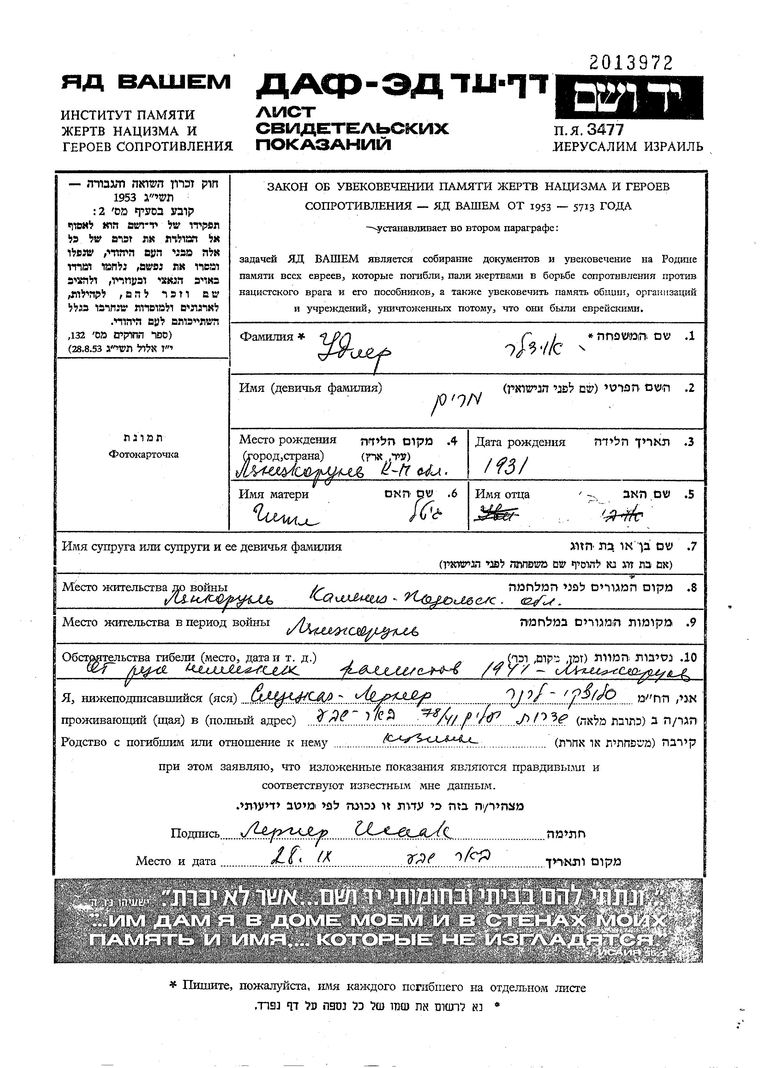 Udler Miriam 1931 Laskorun, Ukraine (UdSSR) Gedenkblatt